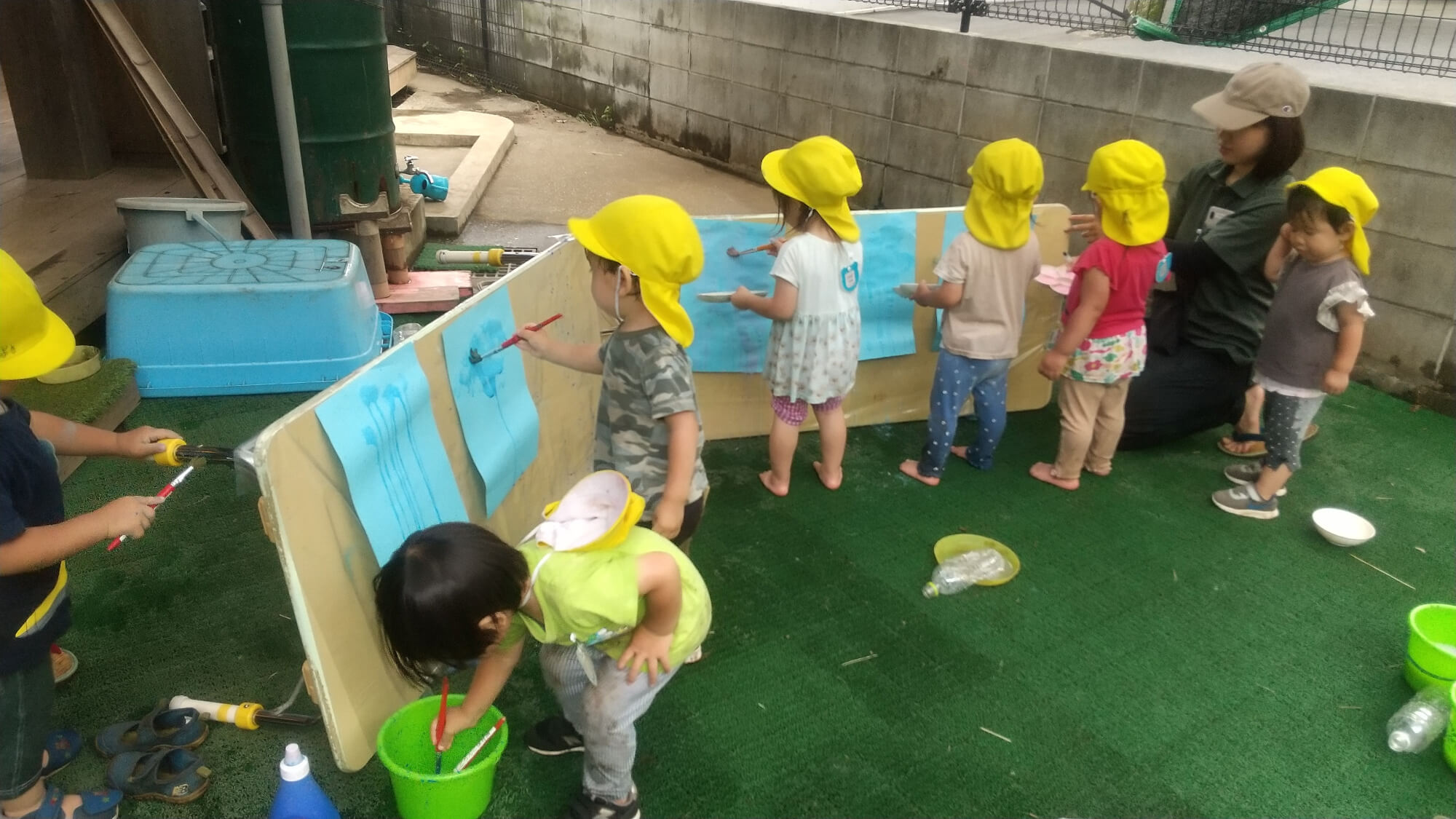 絵の具で雨を表現した制作も行いました。絵の具がぽたぽた垂れる様子を見て「あめみたい~」と口にして、雨を思い浮かべる子もいました。