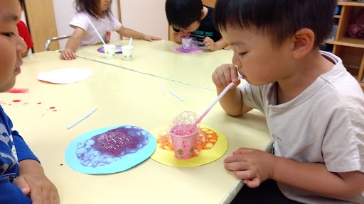 むぎ組(4歳児)は、吹く息を調節しながら紫陽花を表現する子もいました。強く吹いた時の泡の様子や「ぶくぶく」という音を面白がって楽しんでいました。