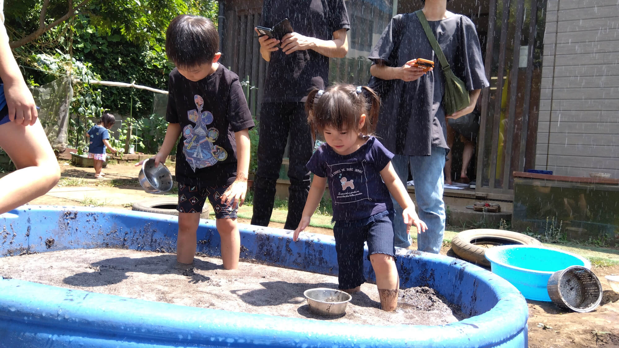 例年行っている宝探しでは、土と水で混ぜたプールの中にキラキラと光る宝が埋まっており、それを一生懸命探す姿が見られました。1番人気ではないかというほど並んでおり、「THE どろんこ保育園」という遊び方でした。