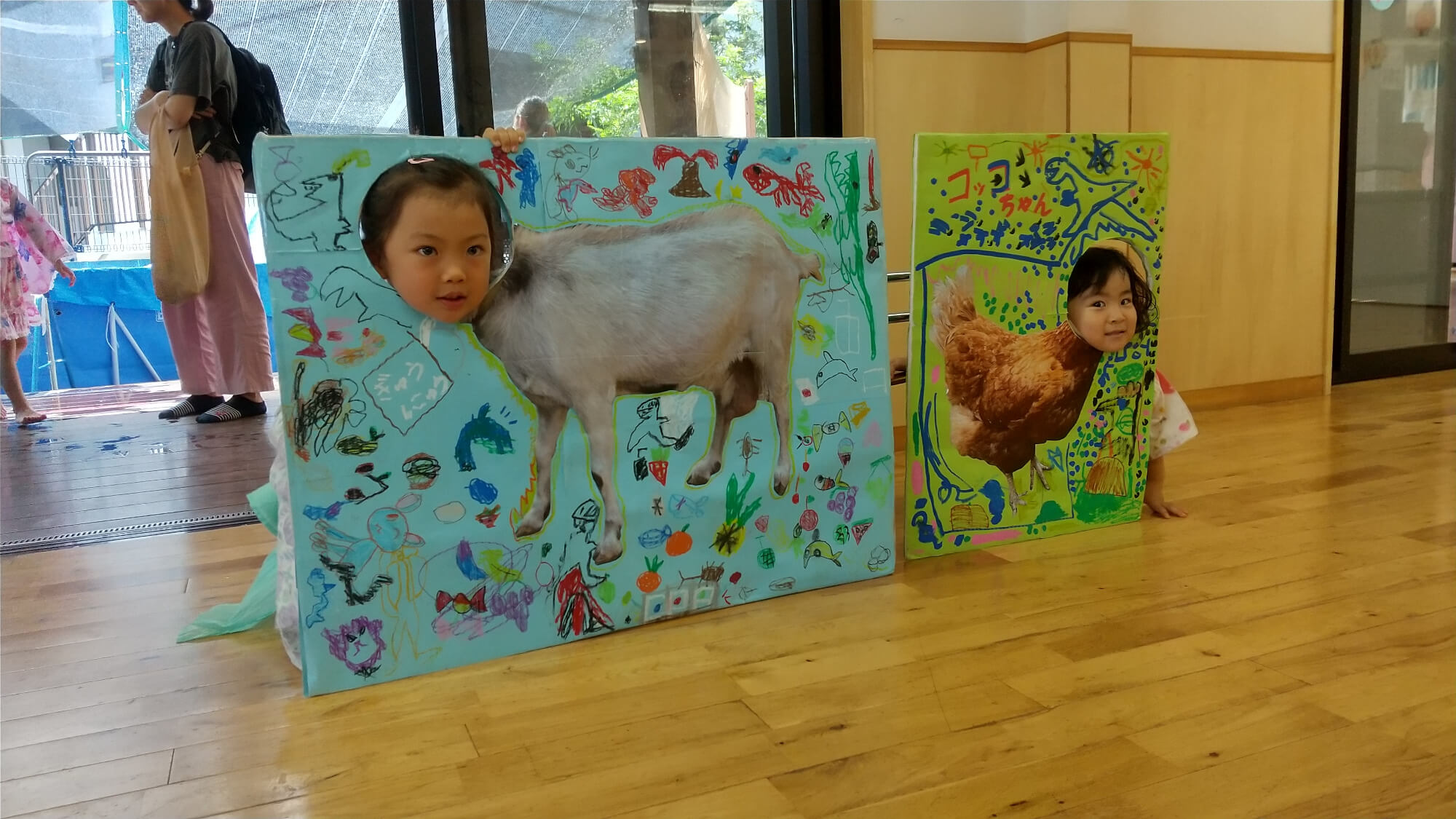 ヤギと鶏の顔出しパネルで遊ぶ子どもたち