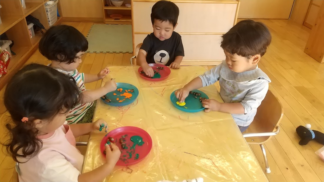 写真は拾ってきたどんぐりを自分たちで「あか!」「みどり!」と色を選びながらどんぐりに色付けをしているところです。皆真剣な表情で一つ一つ丁寧に色付けしていました。