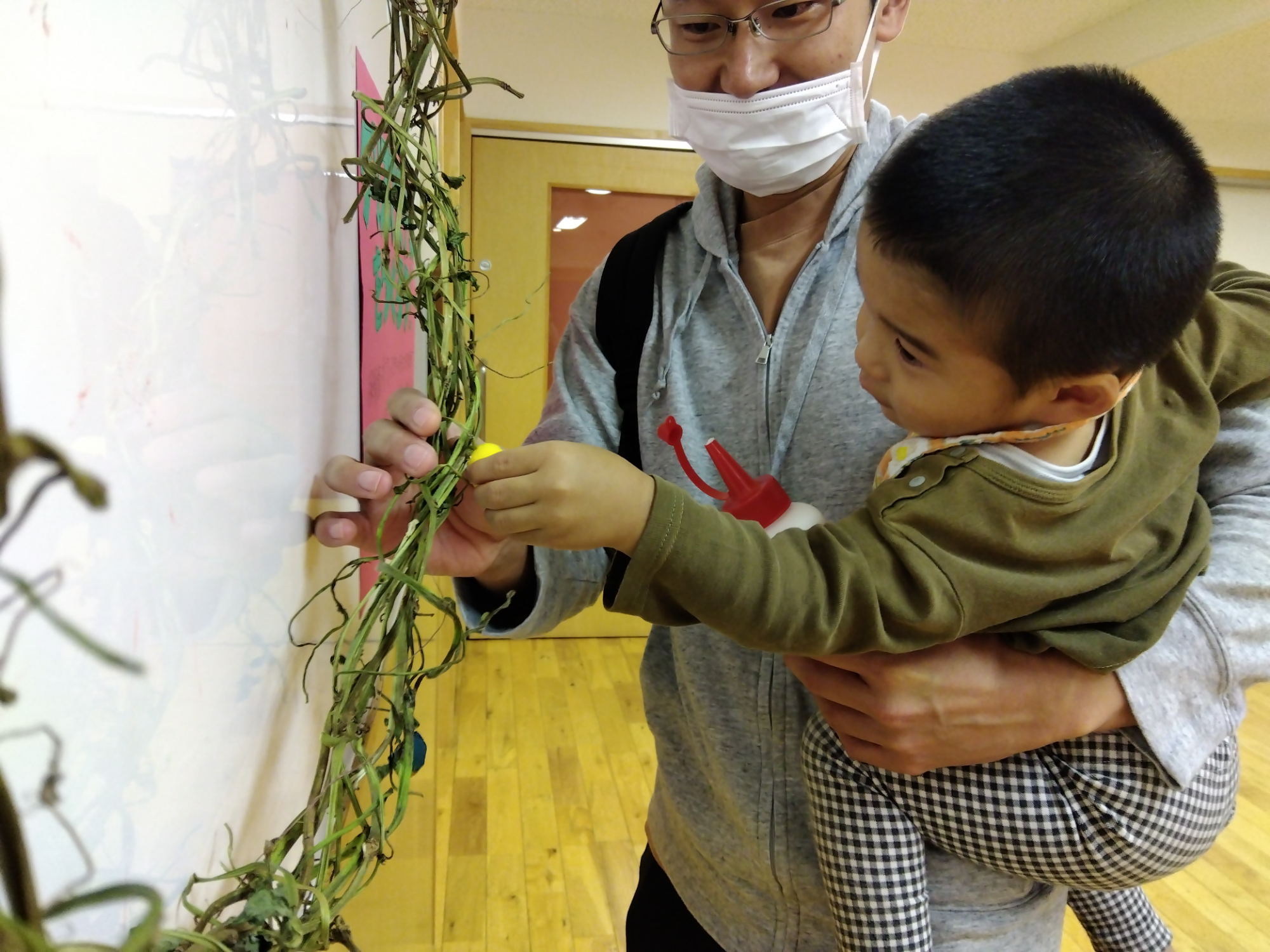 普段からよく散歩先で落ち葉や木の枝で釣りごっこや焚き火ごっこ、ご飯作りを友達とよく楽しんでいます。普段子ども達が楽しんでいる自然遊びを保護者様さまも一緒に感じて楽しめたらと思い、今回あずき組は森のパーティーというテーマで作品を展示しました。