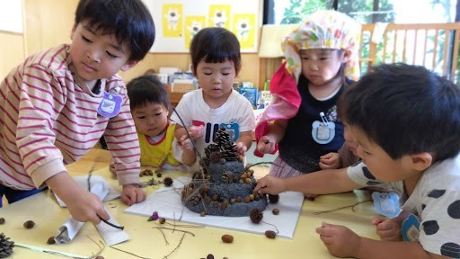 拾ってきたどんぐりでケーキを飾ったり、木に落ち葉を貼ったりして作品作りも元気いっぱい楽しんでいました。写真は、散歩先で拾い集めたどんぐりなどを使ったケーキ作りをしているところです。
