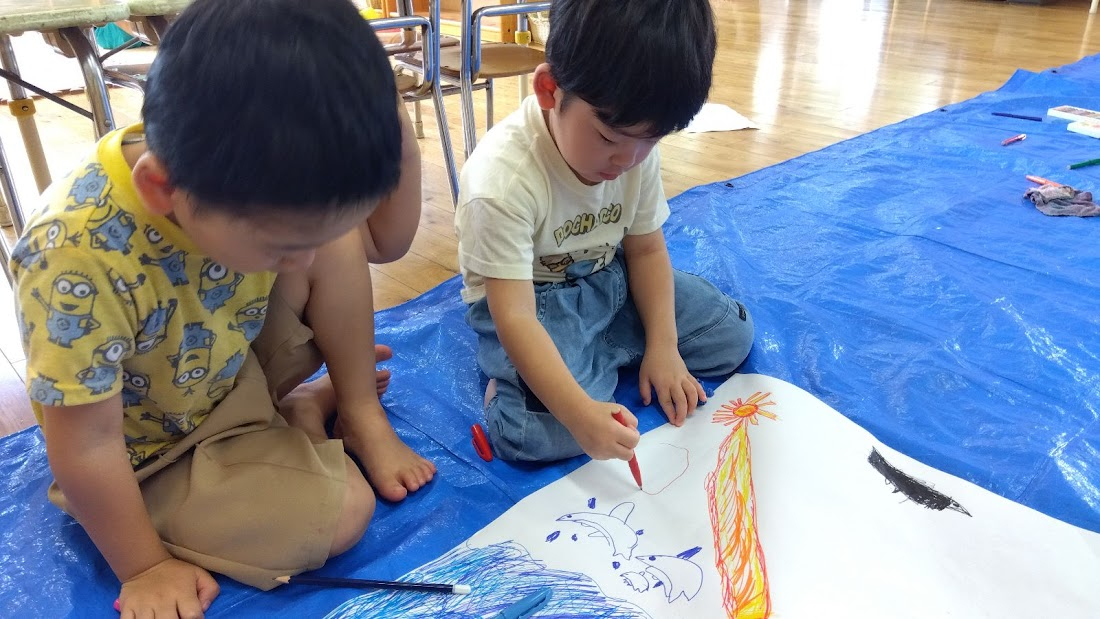 夏に「海」をテーマに水族館の製作を行いました。縦割りのグループに分かれ、どのような海を想像し、どのような水族館を製作するか話し合いを行い、模造紙にそれぞれのグループで話し合ったテーマに沿った水族館を表現しました。