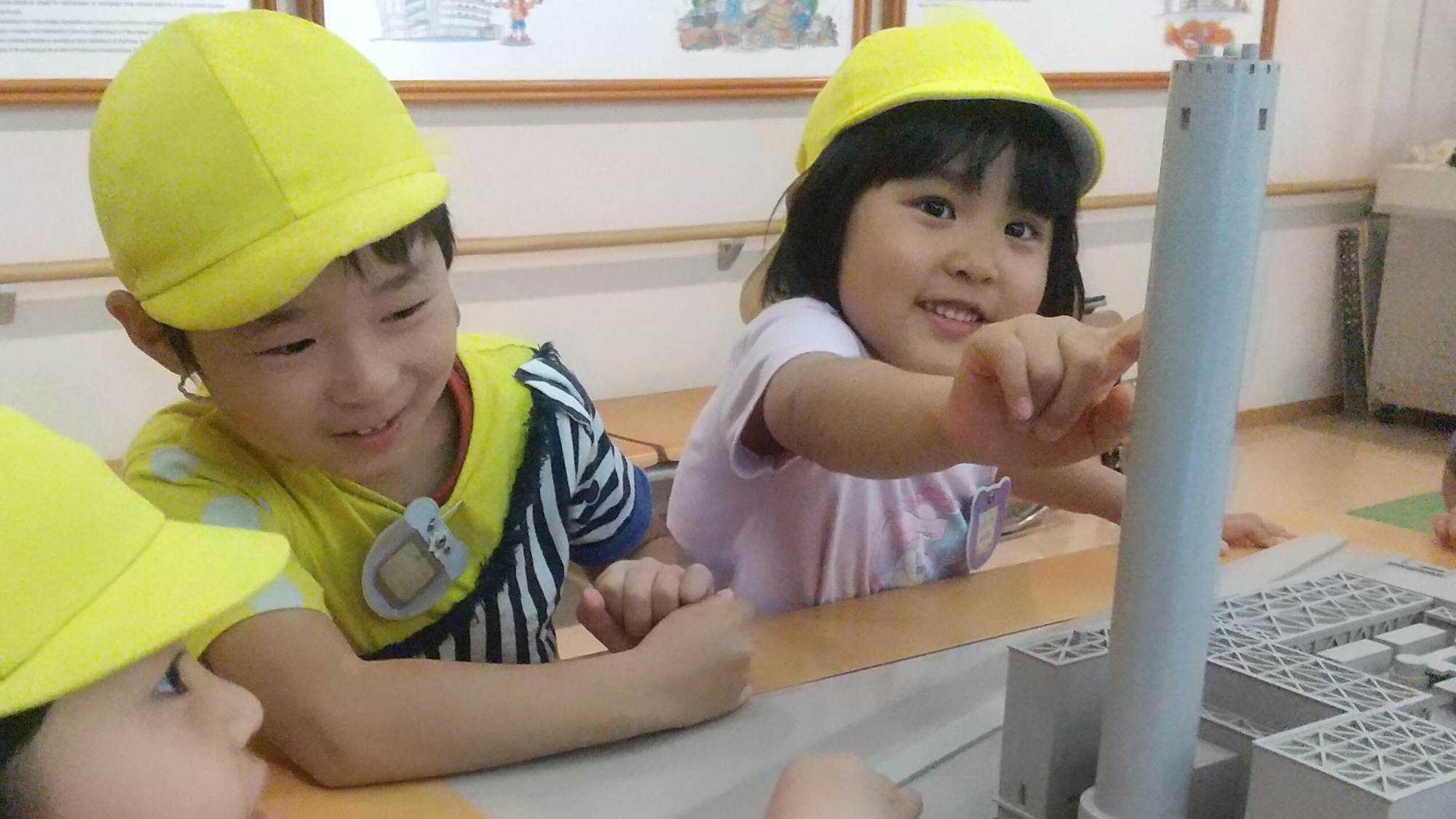 初めに案内していただいたのは「触れる模型」のある部屋でした。清掃工場の立派な模型が置いてあり、実際に模型を触ったりついているボタンを押したりしながら工場にある様々な施設の場所を知ることができました。子どもたちは「このボタン押すとあそこが光ってる!」「煙突こんなところまであるの?」「これがさっき見た煙突だよね!」「ごみ収集車はここに入っていってる!」など大盛り上がりでした。