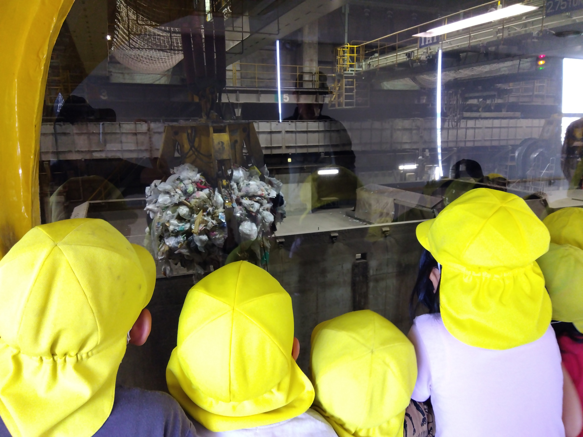 続いての部屋はゴミクレーンが作業をしている場所でした。子どもたちが1番真剣に覗いていたところです。収集されたゴミを大きなクレーンが持ち上げているところを見ると「葉っぱがあるね、保育園のかな?」「こんなにゴミってあるの?」「すごく大きい!」などの声が聞こえました。1つのクレーンで象およそ1頭分の重さを持ち上げることができるそうです。