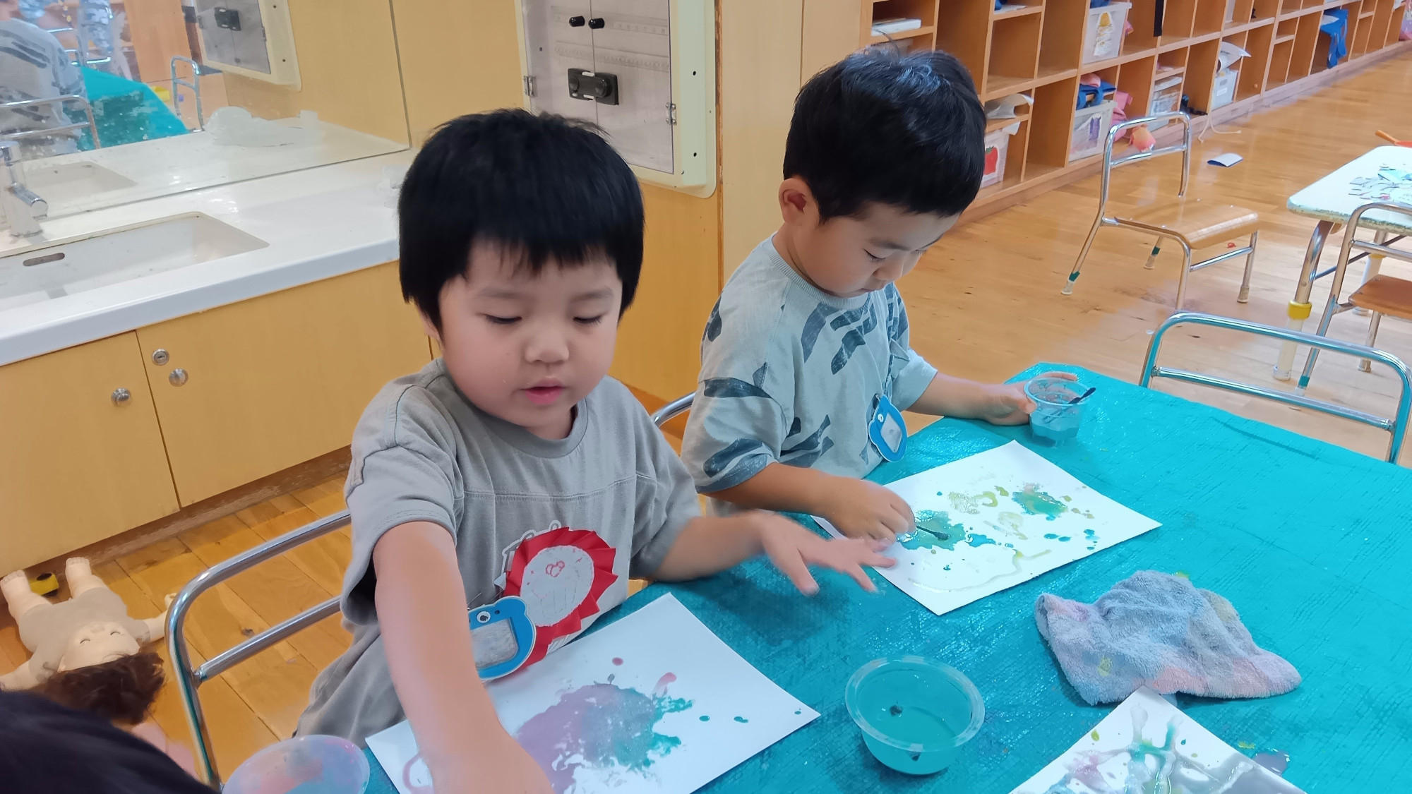 絵の具で色を付ける際ボンドがつぶれないように優しく色をのせていました。「〇〇ちゃんのすごいよ!」などと友達の作品を見て楽しむ姿もありました。