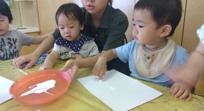 乳児はボンドで絵を描くことが難しいため、保育者と一緒に描いたりフィンガーペイントのようにボンドを指でとって描いたり、手形をとる子もいました。