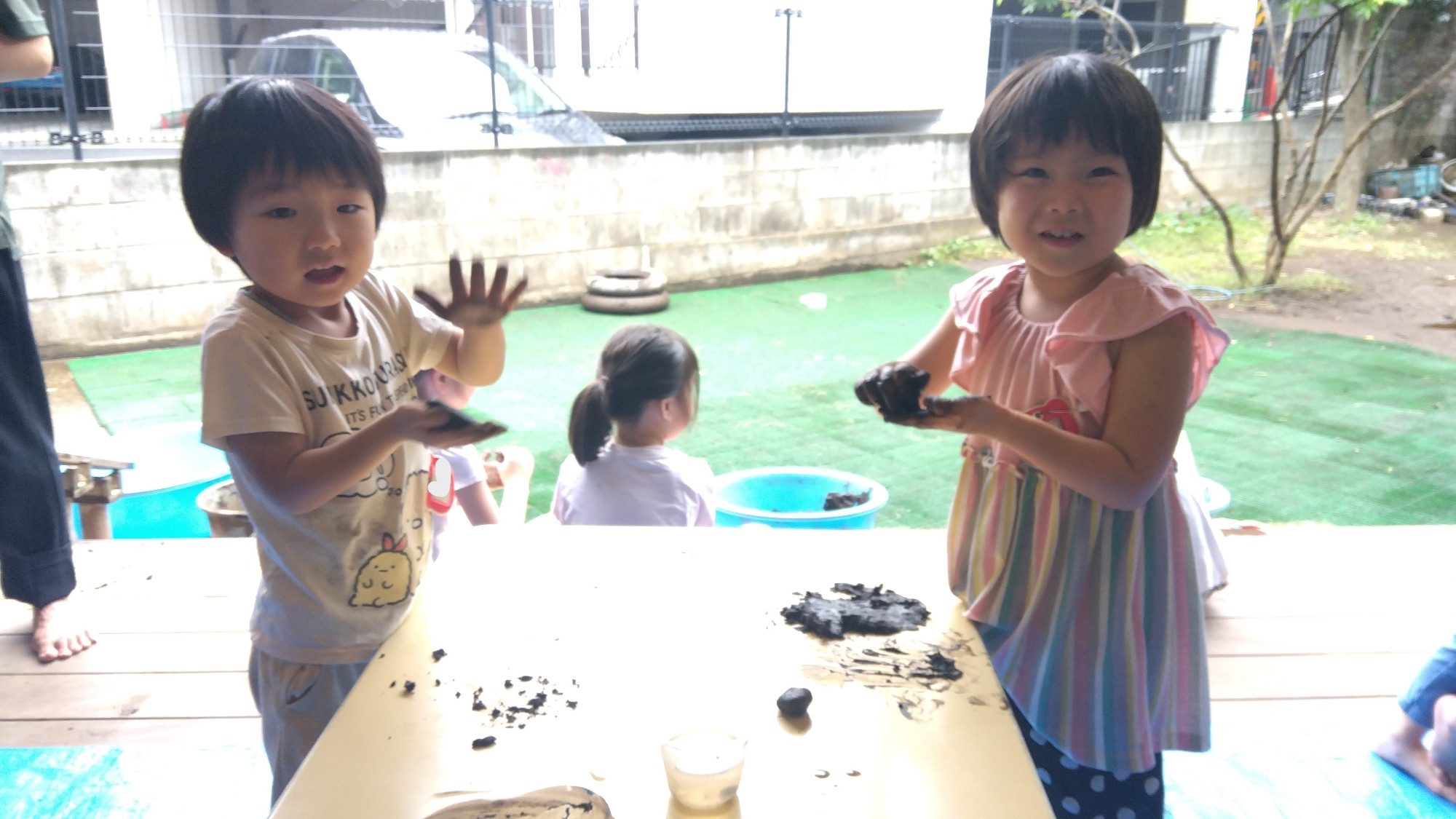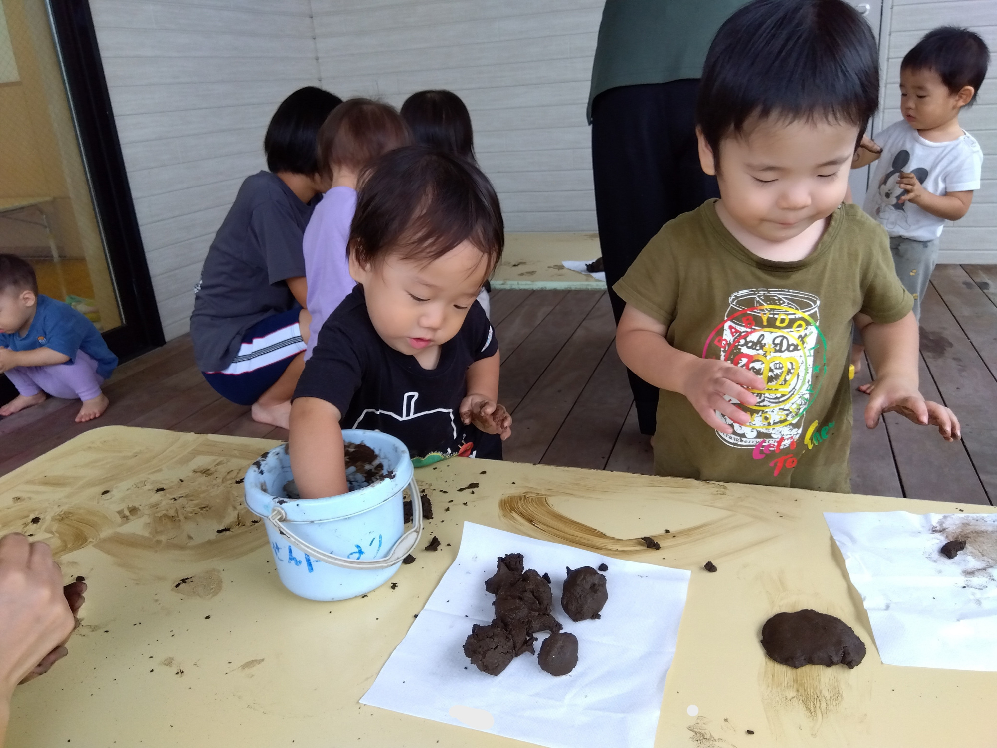 今回の土粘土遊びを通して、泥があまり抵抗なく遊べるものであること、感触や形が変わることを経験しました。また、土遊びを行うことで、雑菌への免疫がついたり五感が刺激されたりといったメリットもありますので、子どもたちの庭遊びに泥が活かしてもらえたらと思います。