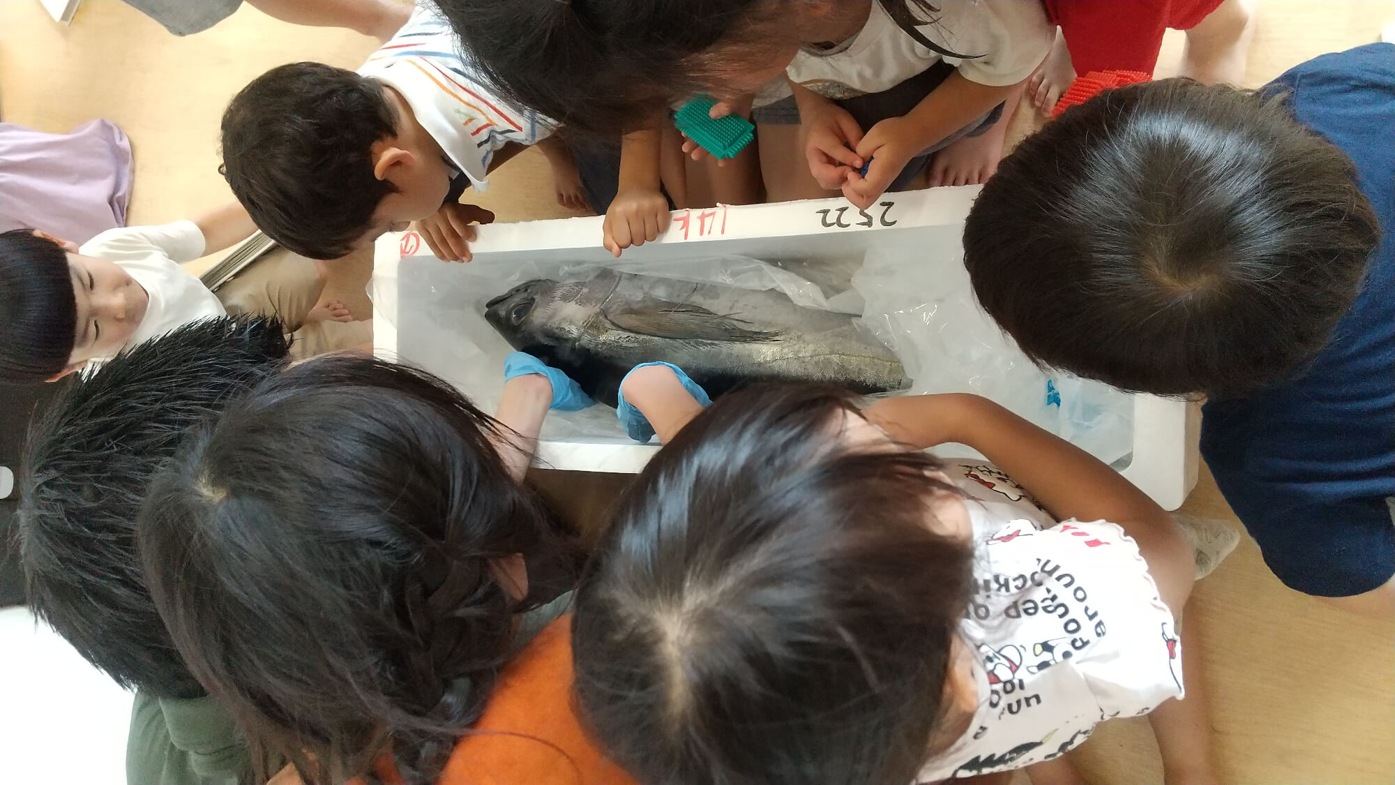 調理スタッフが梱包をほどくと、「わー大きな魚」「なんの魚?」「触ってみてもいい?」と恐る恐る手を伸ばし、指先で感触を確かめていました。