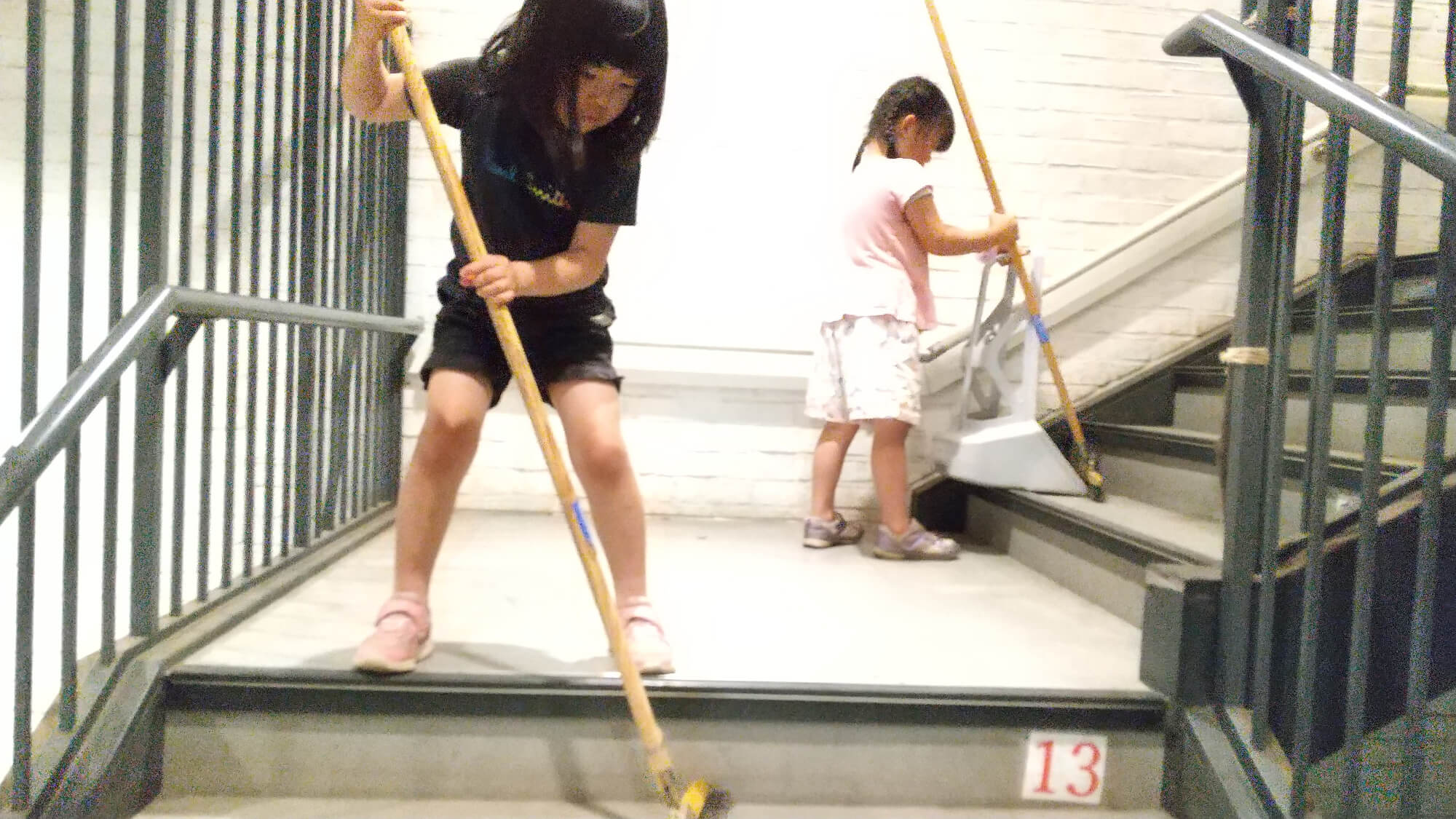 最初は玄関をほうきで掃くことを中心に取り組んでいましたが、徐々に活動範囲が広がっていき、「階段も掃くね」階段も一段一段掃き進めています。