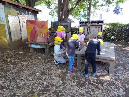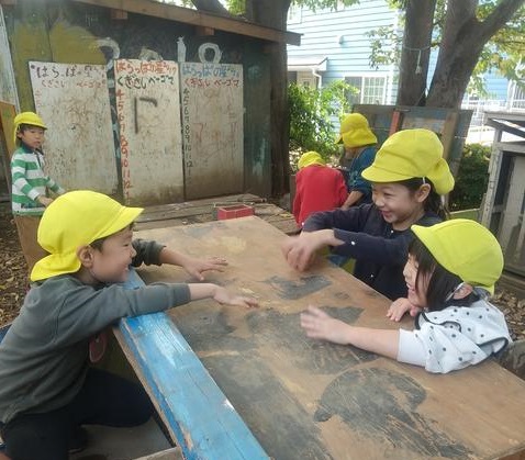 11月になってすぐに、プレーパークで年長児が最近工具をつかってお家づくりをしていました。熱心に取り組んでいたのでそばで会話を聞いていると、「Aちゃんそこ支えてて」「B君はトンカチでそこうって」「オッケー」や、年下の子には年下の子が無理なくできる内容の仕事を与えており、C君がリーダーとなって、家を完成させようとしていました。