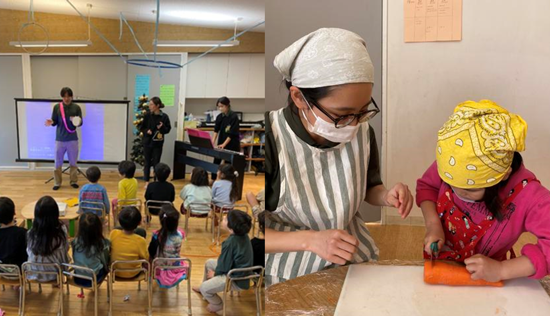 「クッキング」では畑で収穫した人参でキャロットケーキを調理職員と作り、もりだくさんな年末お楽しみ会となりました。
