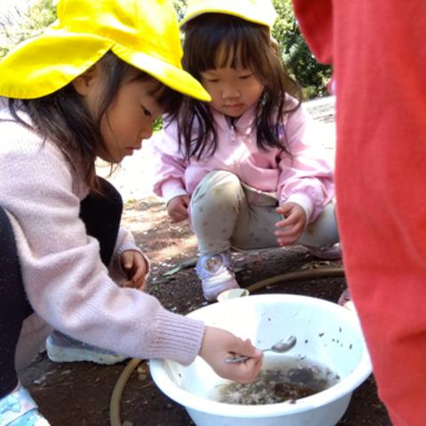 並べたり、水に浮かべてスプーンですくったり、髪飾りにしたり、ジュースやカップケーキにもなっていました。駒沢どろんこ保育園のプランターに植えている花は、自由にとって楽しんでいいことにしています。それを使ってままごとも展開されていました。
