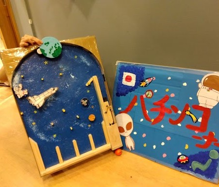 また今年度は、保護者の方がパチンコゲームを作ってくださいました。 木工で各箇所にくぎを打ち、ゴルフボールのボールが転がり落ちるように設計をしてくださいました。本当に素敵なデザインで、完成度も高く、当日も好評でした。