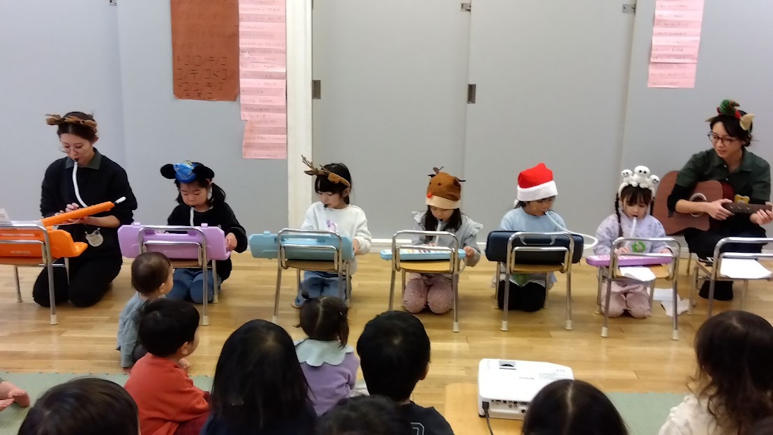 最終日には音楽会も開催され、この日に向けてギターを練習し、ピアノを弾くのが苦手な職員もこめ組と一緒に鍵盤ハーモニカの練習に励み、クリスマスソングの合奏をしていました。緊張で手が震えたとのことでしたが、皆の前で発表をしたことでかなりの自信につながったようです。