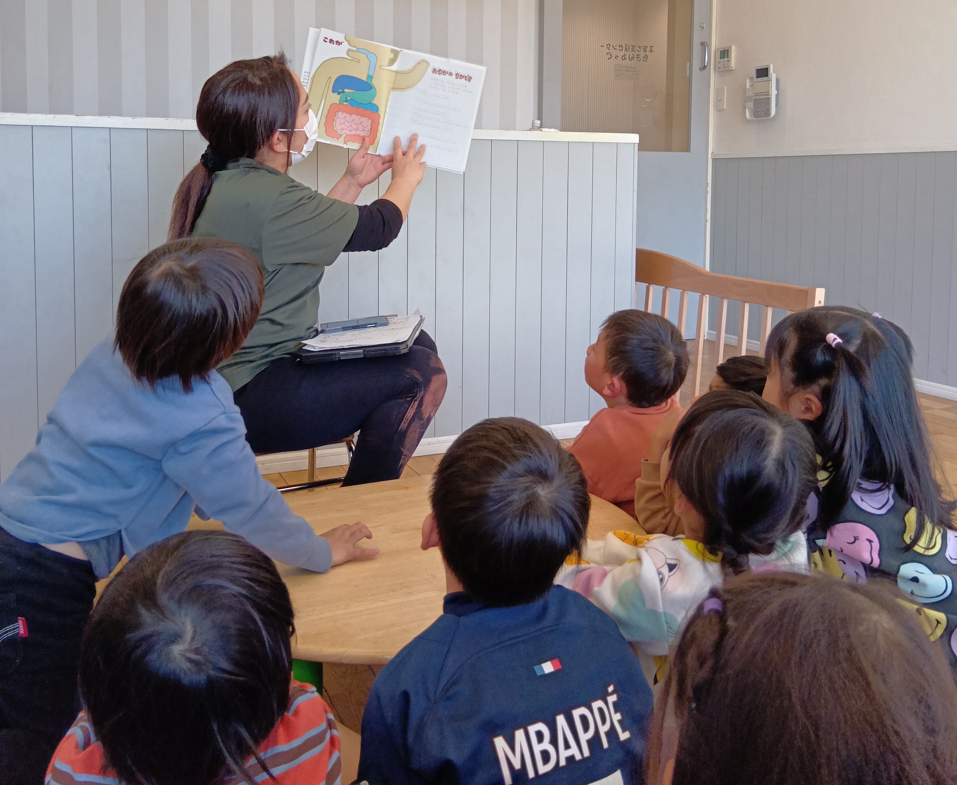 先日栄養士が、食育活動の一環として、食べ物が口から入ってうんちになるまでの話を子どもたちにしました。主に絵本を用いて話をしたのでが、『するするするりんうんちをだすぞ』『いちにちうんち』『そのときうんちはどこにいる』『うんこ』という絵本を用いて話をしました。