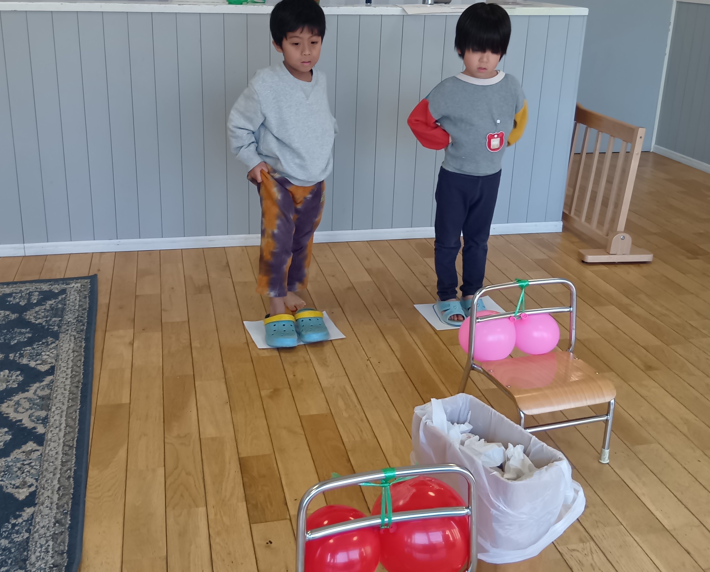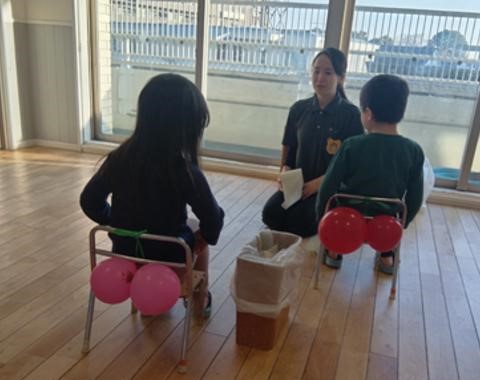 ④は、A保育者のアイデアで、風船を二つ膨らませ、それをつなげておしりに見立て、絵の具で汚れを付け、ウェットティッシュで汚れがなくなるまで拭き取ることに。新しい試みでしたが、かなり実践に近い方法だったので、子どもたちも興味深く話を聞き、疑似体験を楽しんでいるように見えました。