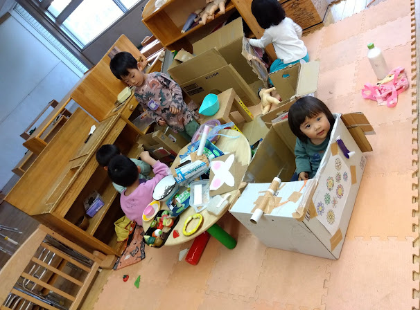 廃材を使用する制作が好きな子どもたちが多く、「先生、段ボールください」と事務所によく取りに来ます。段ボールや、給食室からでるラップやアルミホイルの箱、お菓子の箱も大人気です。