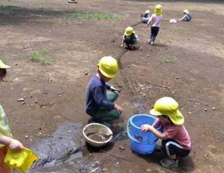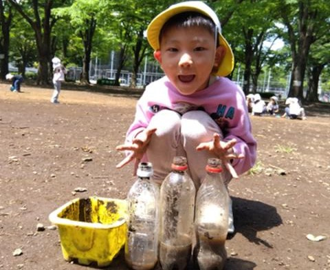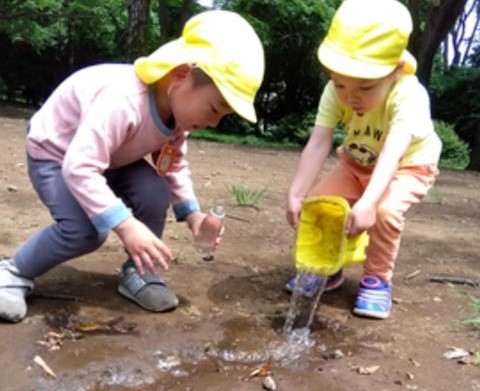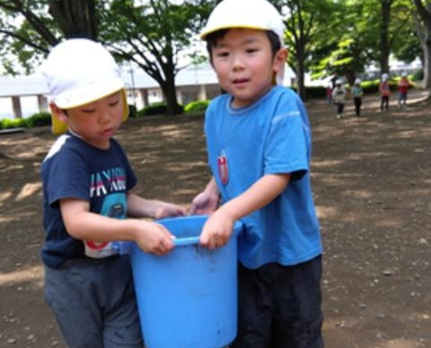 バケツだけでなく、ペットボトル、桶、カップを用意することで、いろんなアイデアが出てくる様子も見られます。今後も子どもたちの興味、関心、発達をとらえながら様々なアイデアを引き出していきたいです。