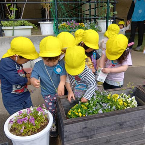 駒沢どろんこ保育園では、保育園生活最後の行事である卒園式に、ビオラを購入し、花道として飾っています。そのビオラを、入園式が終わったらプランターに植え替え、園の入り口が華やかになっています。