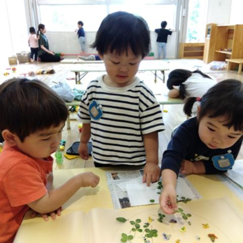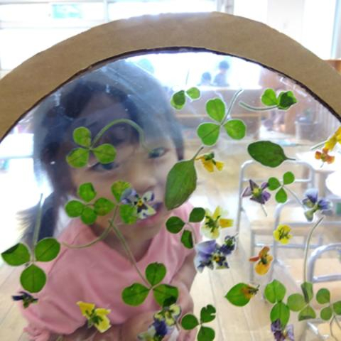 完成した押し花をラミネートし、サンキャッチャーにしていました。光にかざすと色鮮やかでとてもきれいです。窓際にかざすと、子どもたちも大勢集まり、色鮮やかに光るサンキャッチャーを見上げて「きらきらしてるね。」「きれいだね。」と、歓声を上げていました。