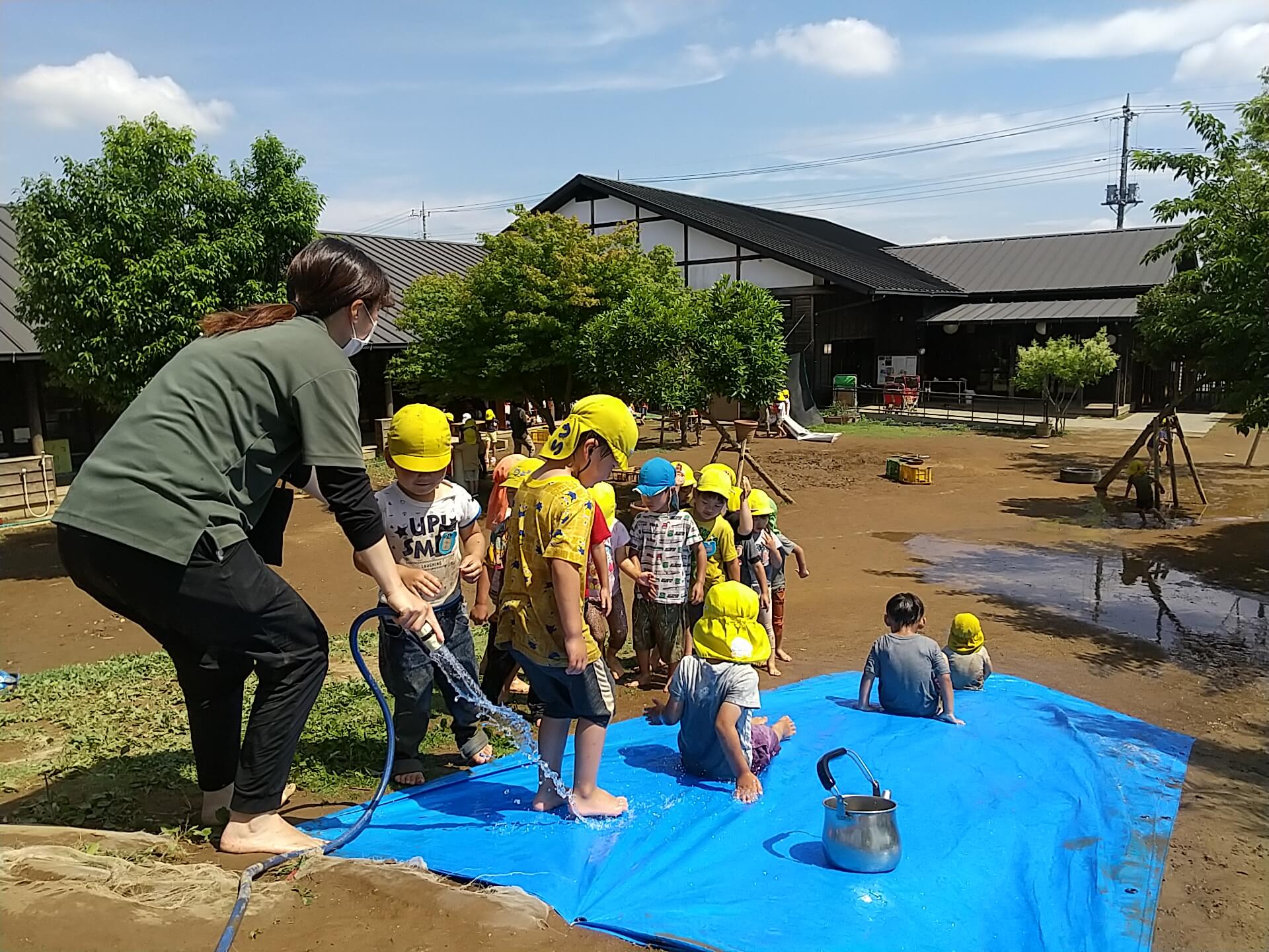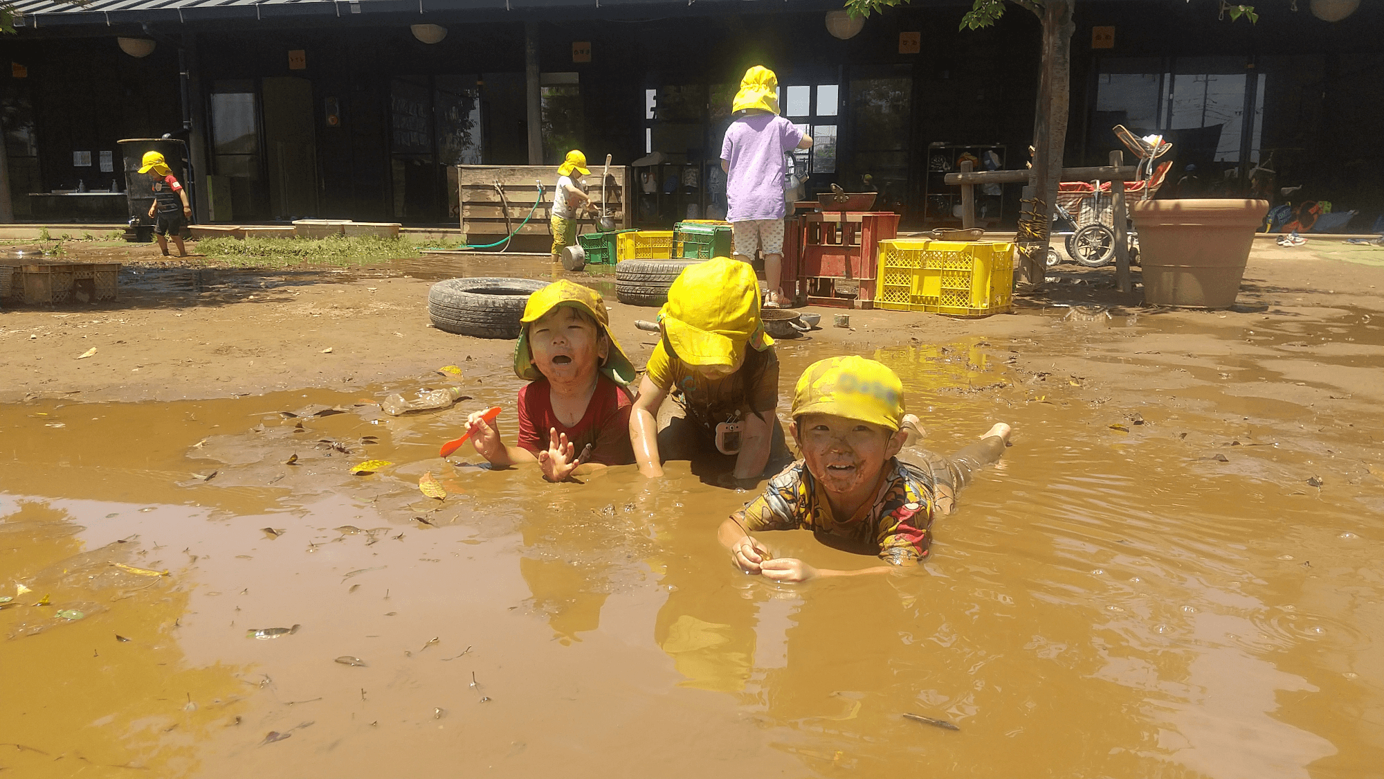 暑くなり子どもたちは自然と水・泥遊びに夢中になっています!
