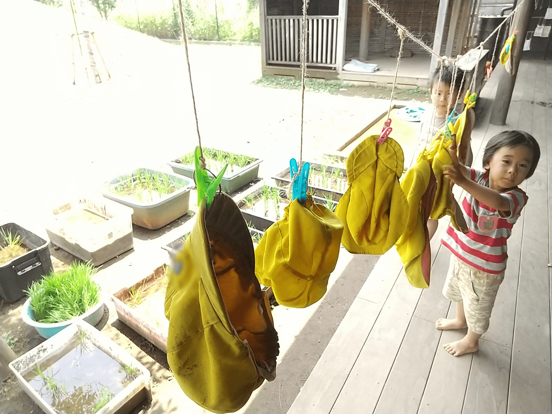 泥だらけになった後は自分たちで洗濯した帽子を干して、また午後の遊びに備えます。