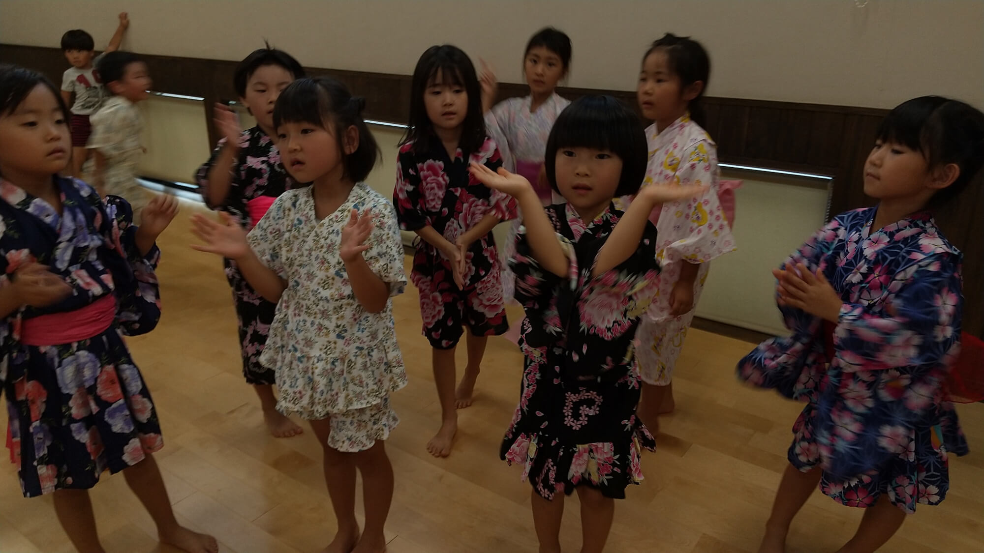 日々楽しんでいる「エビカニクス音頭」ですが、特別な気分を味わえた日がありました。それは、蝉の鳴き声が残るある日の午後。浴衣や甚平を着た5歳児による色鮮やかな情景がありました。