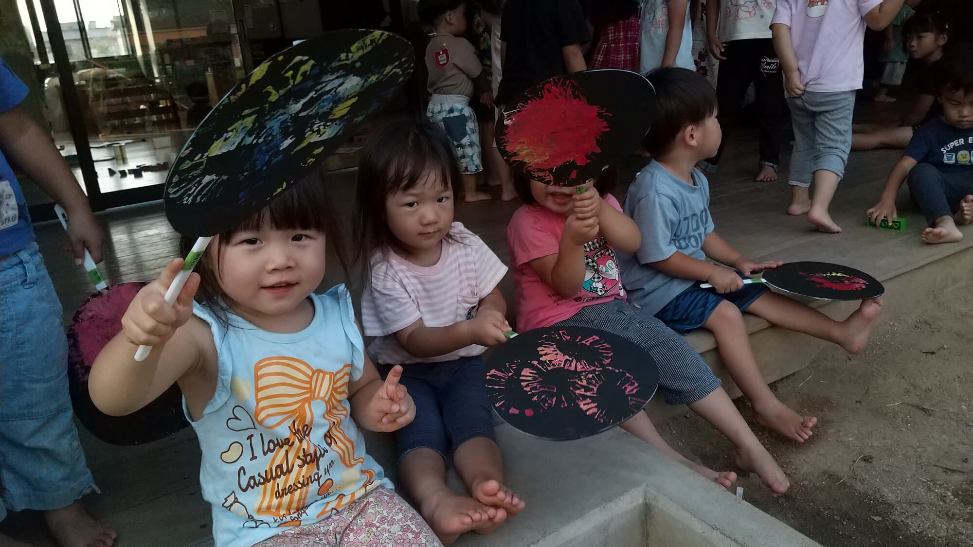 友だちや先生と一緒に踊るからこそ楽しく、その楽しさが表情や体の動きに活き活きと表れていました。2歳児は手作りのうちわを持って涼しげな様子です。