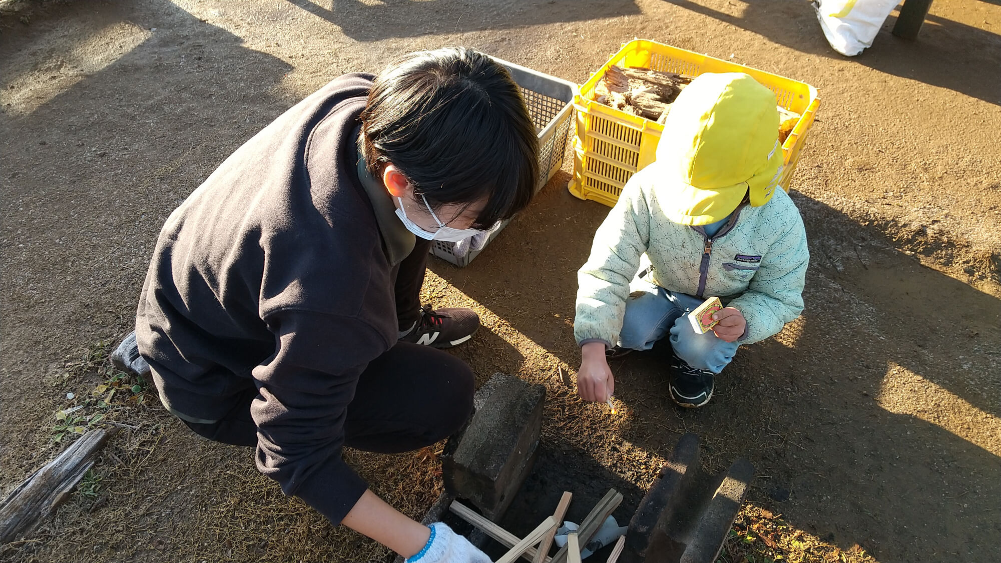 薪割りやマッチで火起こしが始まると「これは何?」「やってみたい」と本物の道具に興味津々の子どもたちは、挑戦してみることにしました。