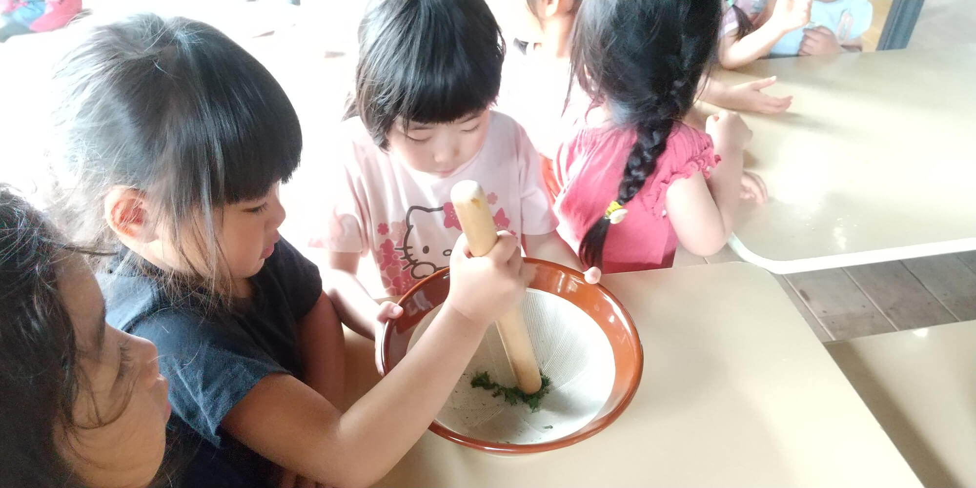 さて、4月は「ヨモギを」と題して、ヨモギを使った食育活動を楽しみました。