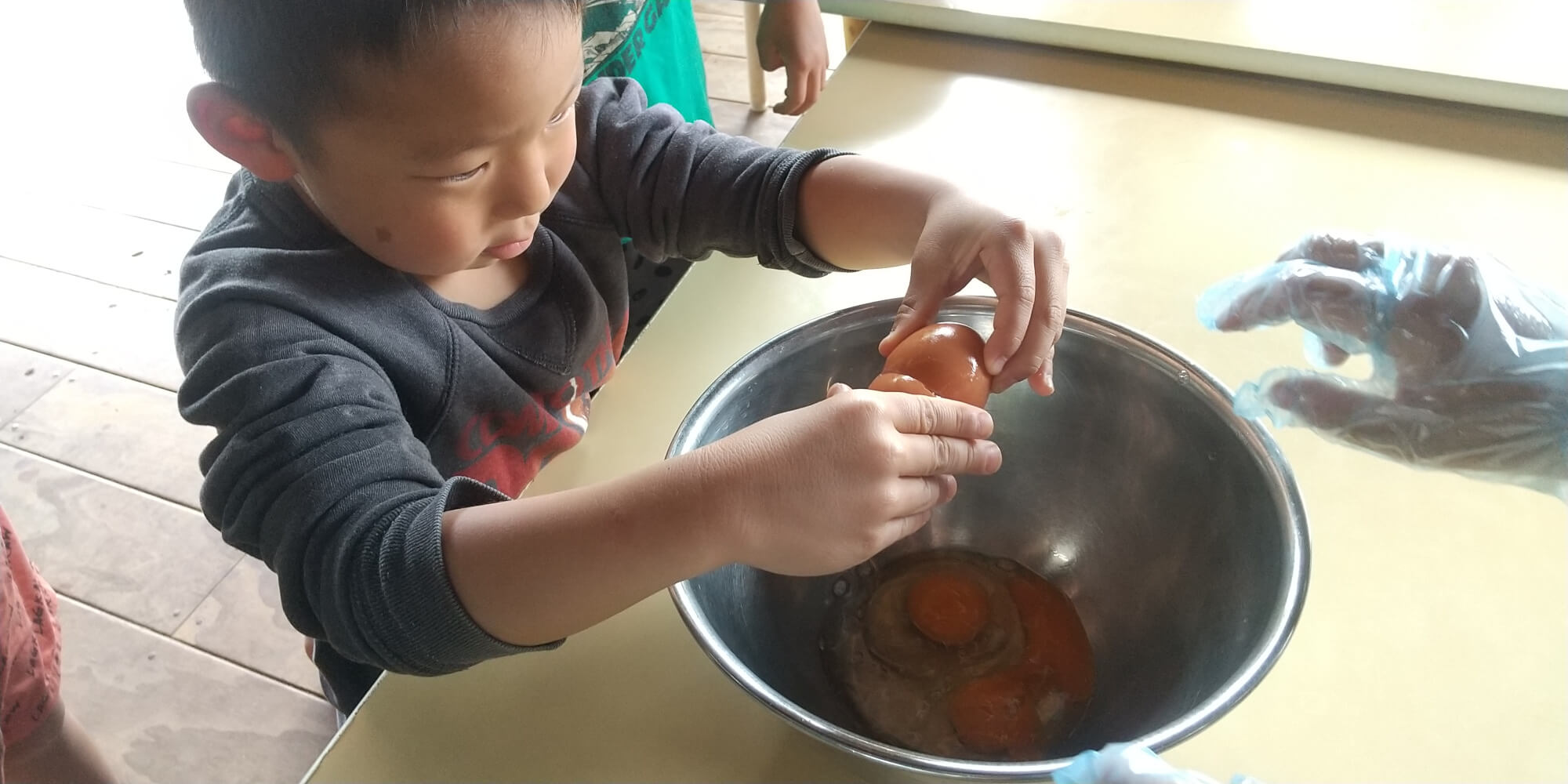 他にはどんな食べ方ができるか…と子どもたちと相談し合い、「ヨモギのホットケーキ」づくりにも挑戦しました。ホットケーキの材料の卵は、もちろん園の鶏の朝採れ卵です。