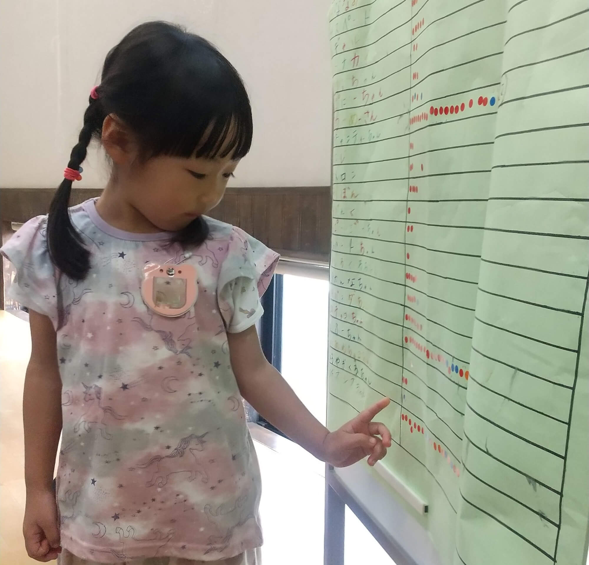 発表の日、子どもたちが投票されたシールの数を数え、トップ3は21、22、23票と僅差で大盛り上がりでした。結果は、「オレオちゃん」に決定しました。