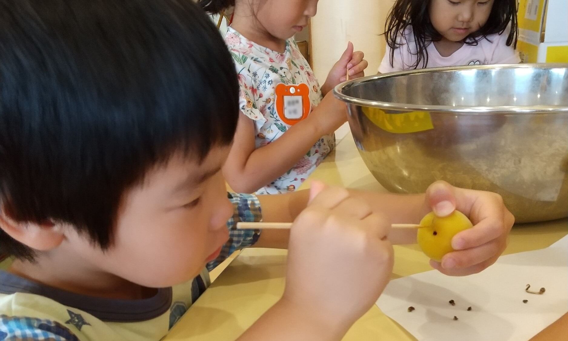 梅仕事の取り掛かりは、4・5歳児が竹串を使って梅の生り口(なりくち)と呼ばれるヘタの部分を丁寧に取り除くことから始まります。
