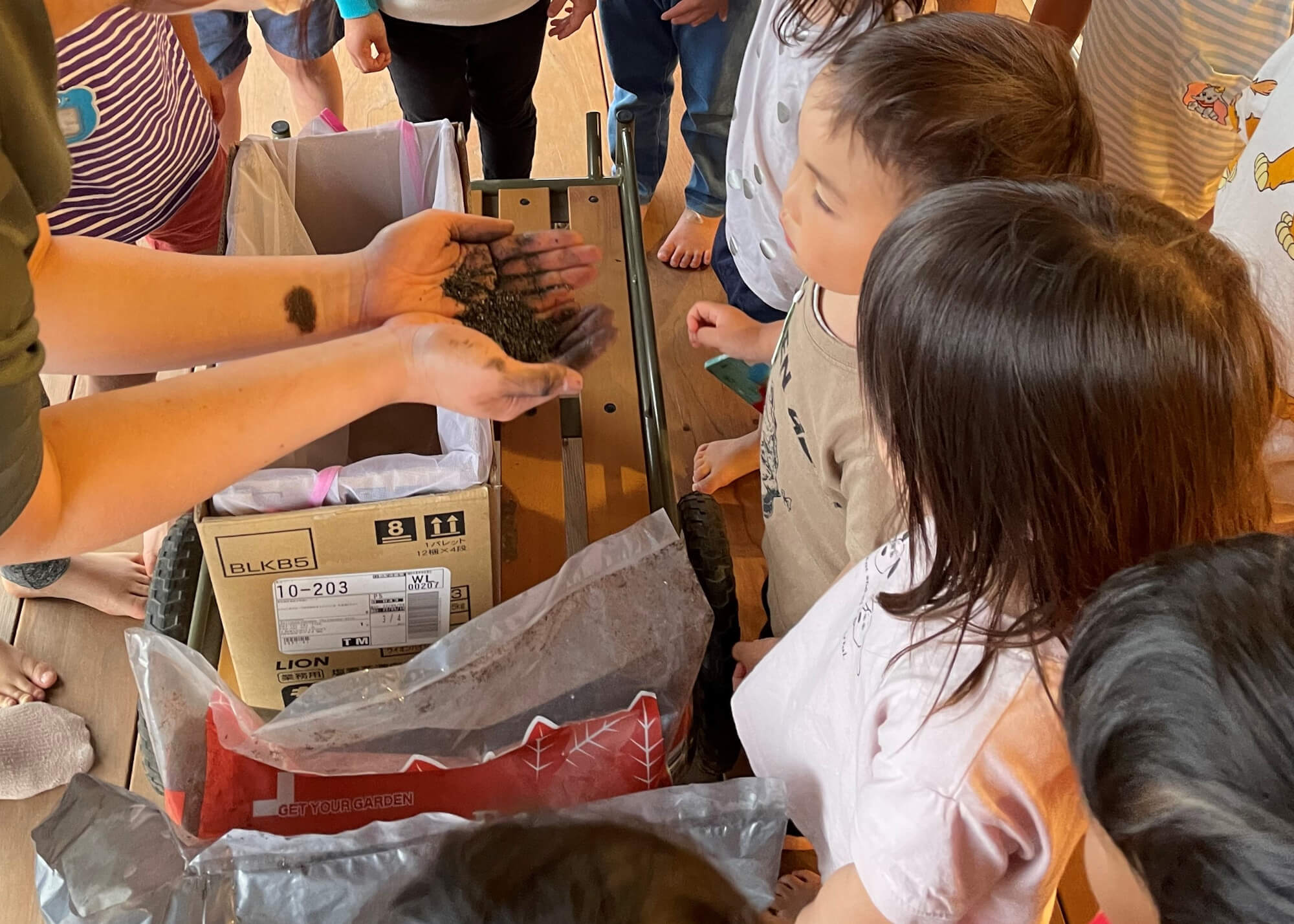 野菜くずをコンポストに入れることでたい肥になり、それが土の栄養になって自分たちが食べる野菜ができ、それがまた野菜くずになる……。日々の生活を通して、大人が言葉にしなくとも経験として子どもたちは食の循環を感じています。