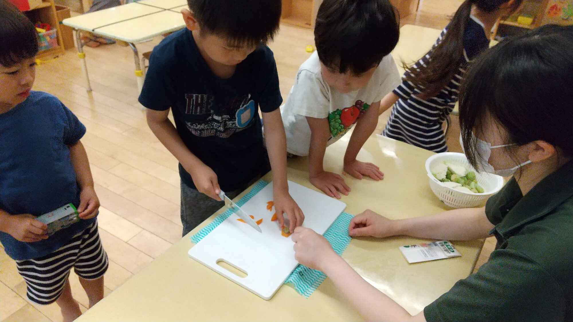 昨年度から取り組んでいた段ボールコンポストは二年目を迎え、子どもたちの生活の中にも定着してきました。コンポストに入れる野菜くずは、五歳児こめ組の子どもたちが包丁の練習を兼ねて細かく刻んでいます。