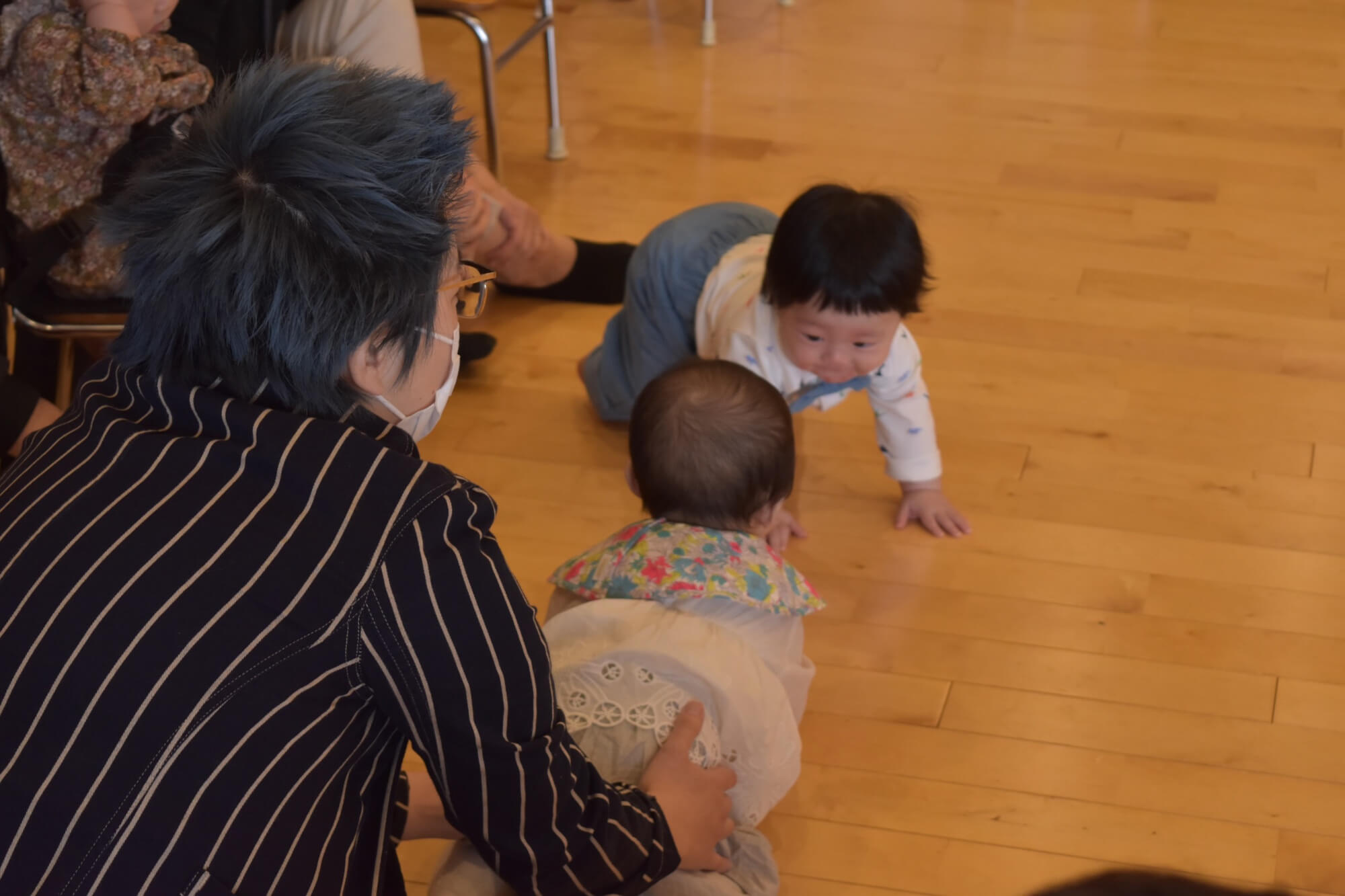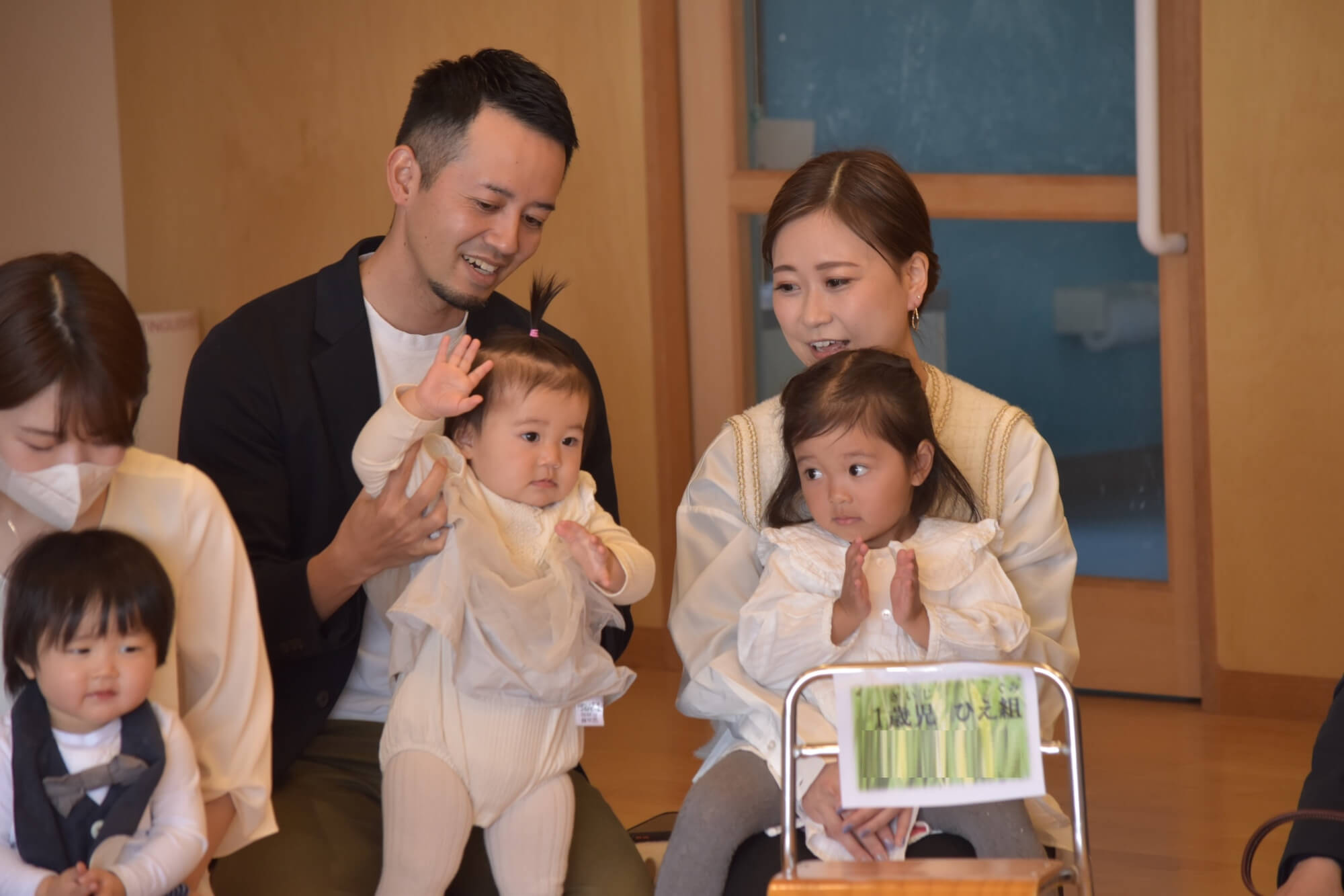 スタッフの紹介と新入園児のお友達の紹介も行いました。保護者の方の膝の上に乗り少し緊張した様子でしたが、自分の名前が呼ばれると元気に返事をしていました。