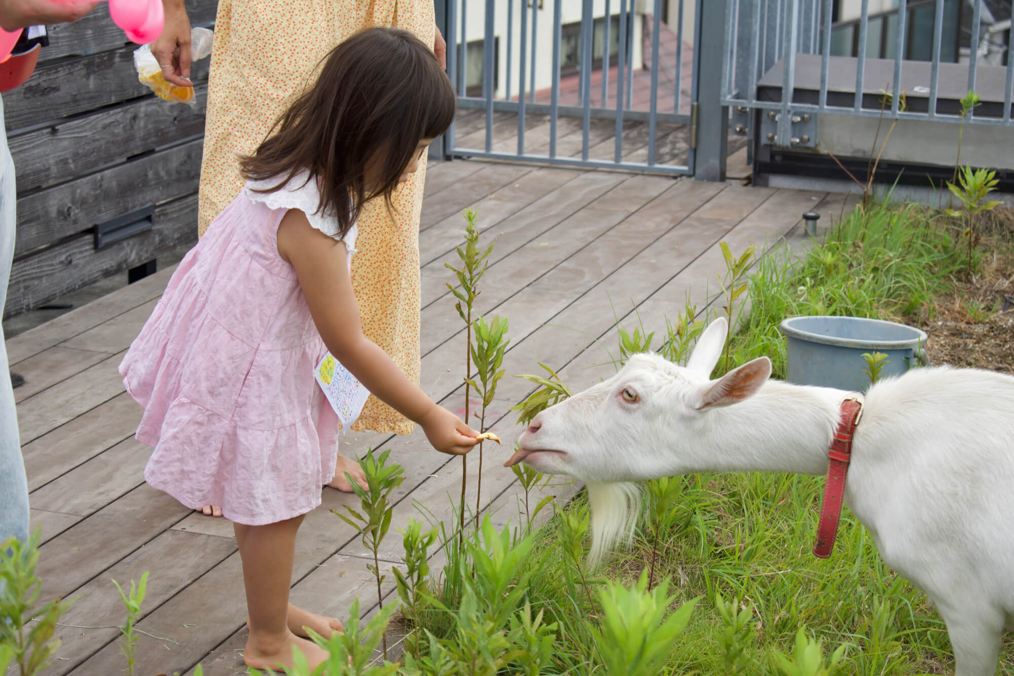 さらに屋上では、どろんこプールにヤギのエサやり体験と、どろんこ保育園の代名詞ともいえるコーナーが揃いました。普段なら自分よりも大きなヤギの体に怖がる子どもたちも、お父さん、お母さんが一緒の日には自然と勇気が湧いてきたようです。