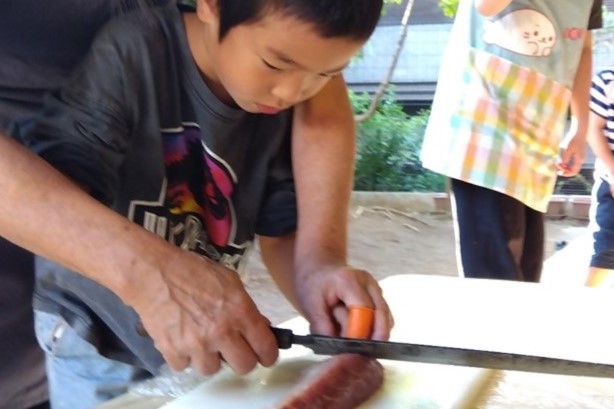 「あんなおっきい魚はじめてみた」「あの魚をぼくが切ったんだよ」と友だちと気づきや学びを伝えあう姿が印象的でした。
