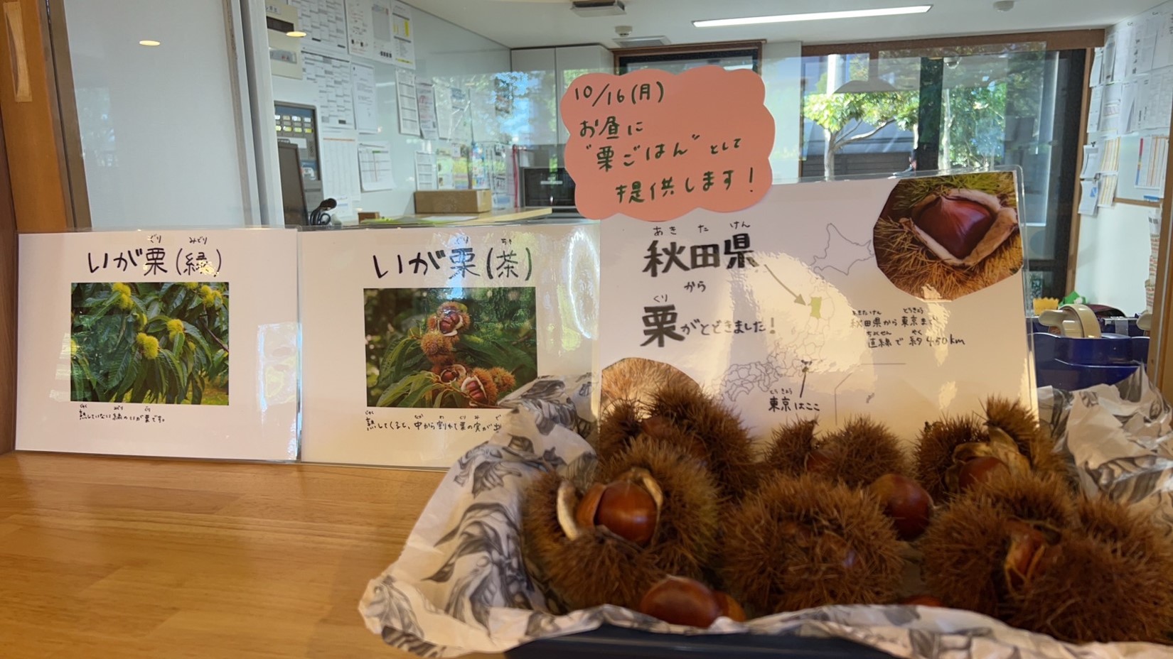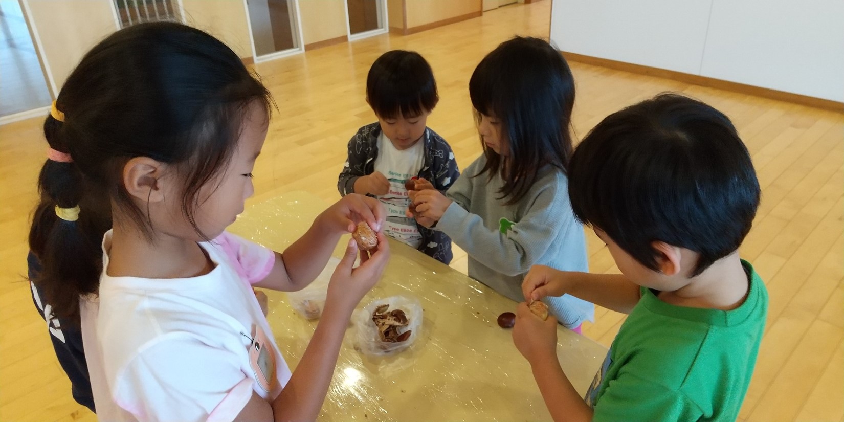 栗の食育体験では秋田県で採れた毬栗(いがぐり)を使用し、絵本から栗の成長過程や形の特徴などを学び、実際に皮を剥きました。