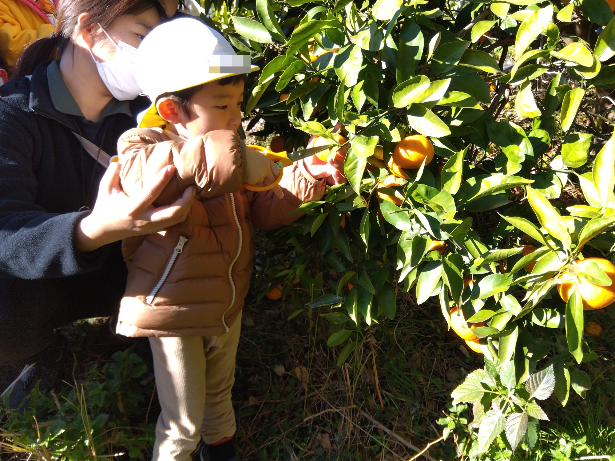 たくさんの実がなるみかんの木を見て「みかんってこんな風にできるんだ」と植物の育ちに興味を示していました。一人ずつ鋏を使い、好みのみかんを採り、段々畑の上で食べたみかんの甘い味に感動していました。