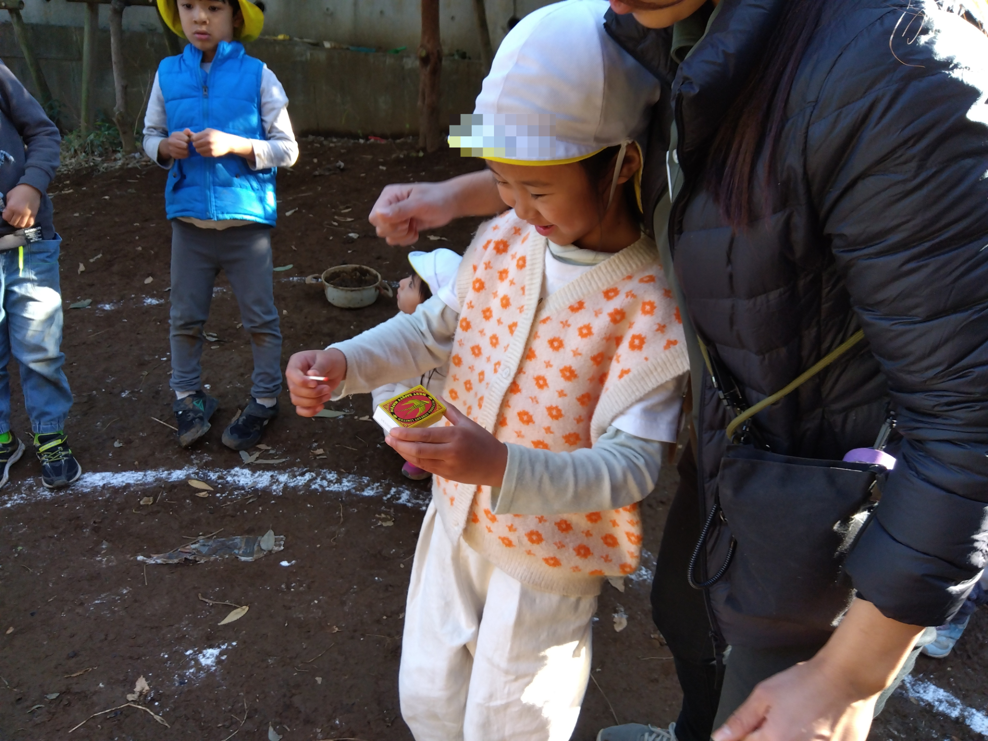 12月の遠足は2、3、4、5歳児でバスに乗って東寺尾どろんこ保育園に行きました。バス遠足の特別感に胸を躍らせ、行きのバスの中では「みかん狩りできるよ」「焚き火もやれるよ」「早く着かないかな」ととても楽しみにしていました。