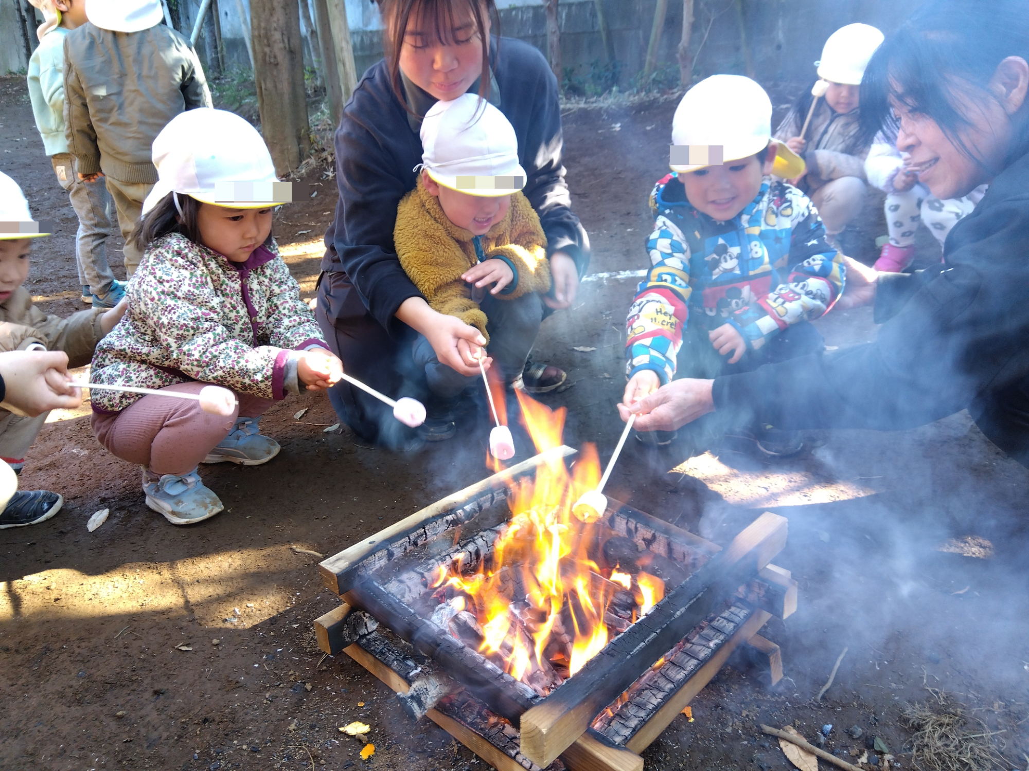 焚き火体験では4、5歳児はマッチを使用して火をおこしました。保育園では初めてマッチを使用したので緊張しながらマッチを擦る姿、自信満々な姿と様々な反応がありました。自分たちの力で火をおこし、焼いたマシュマロは少し焦げてもとても美味しく大満足でした。