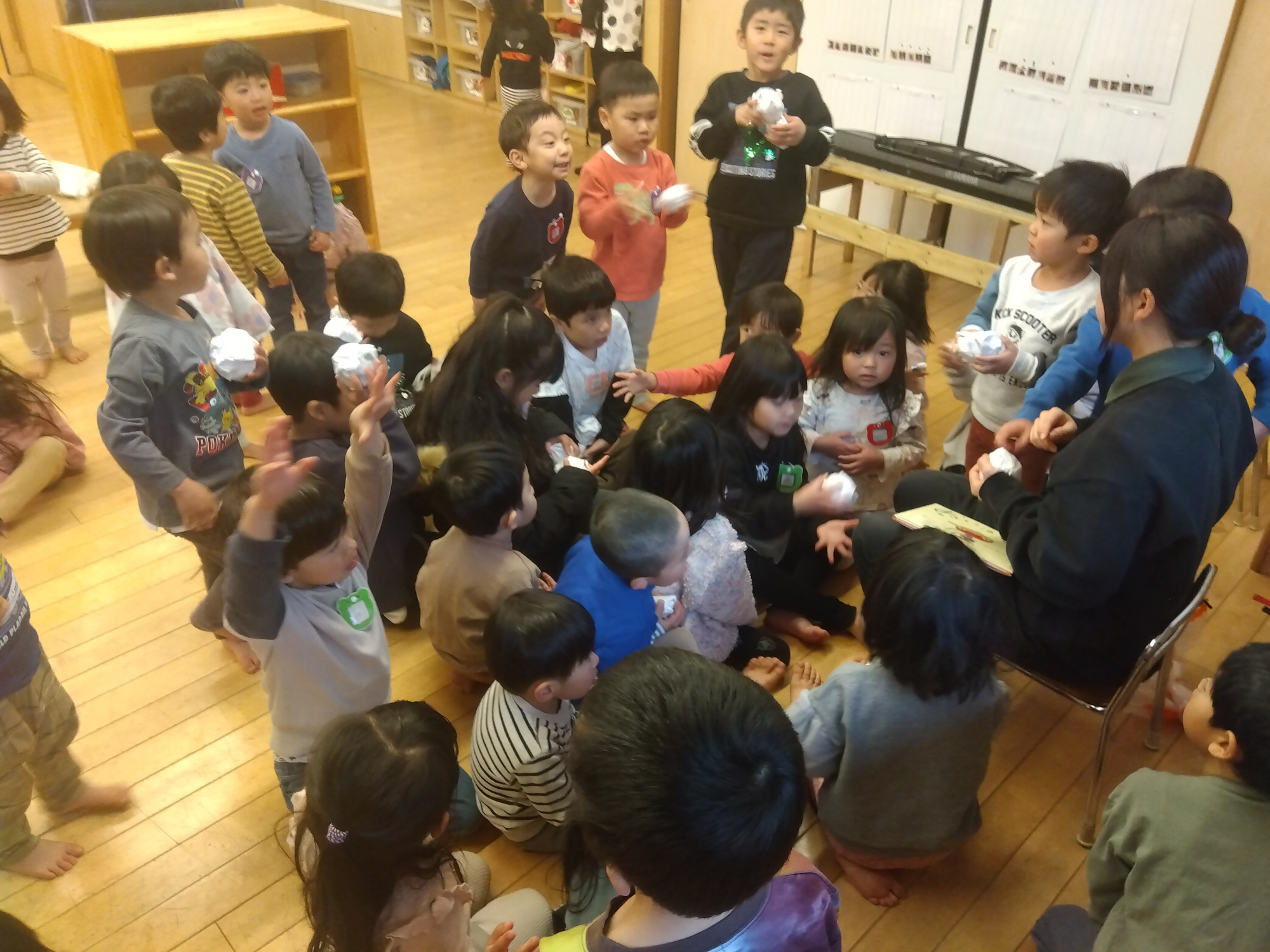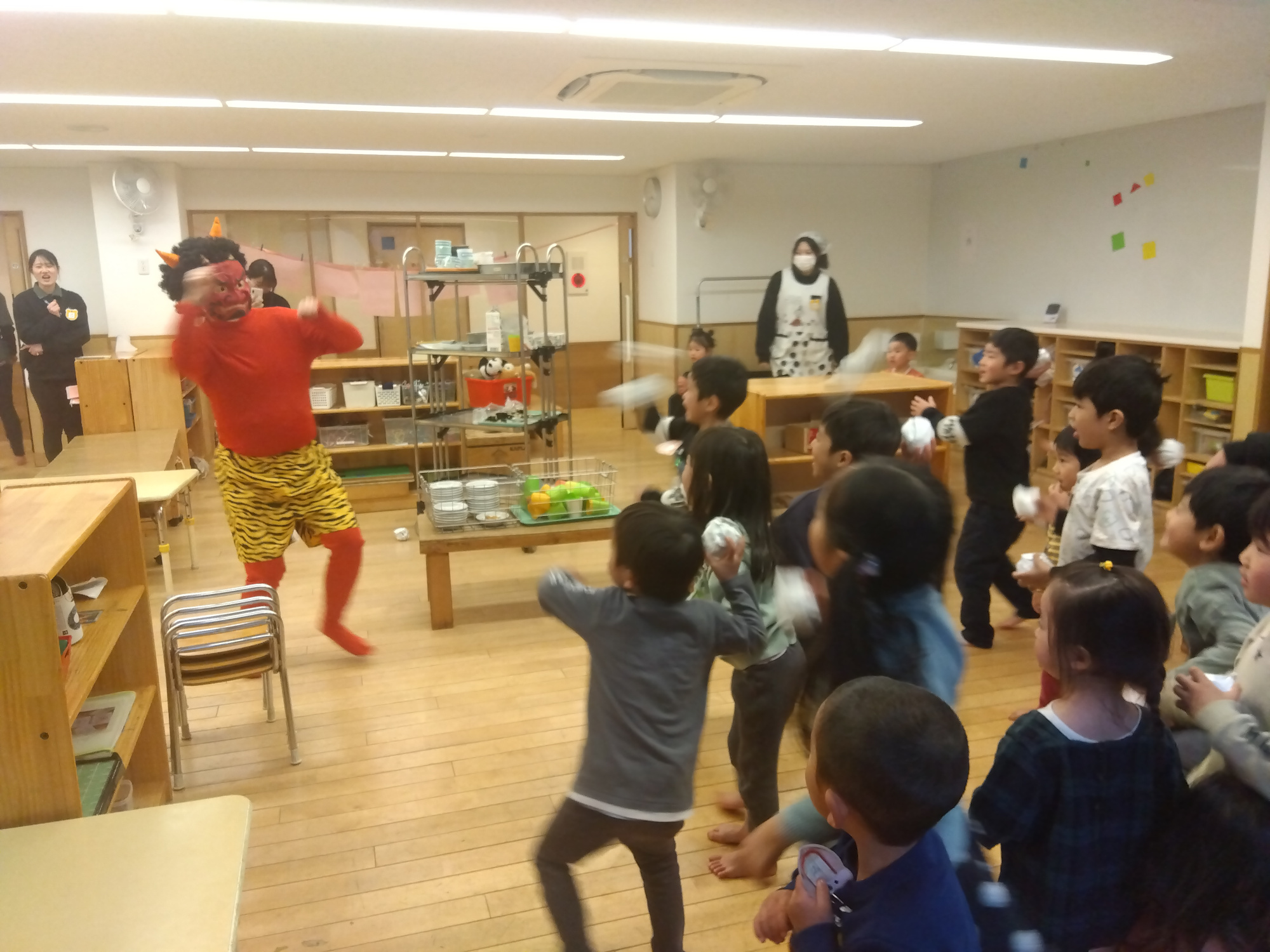 肝心の鬼が来ると、意味を知っていたとしても怖いのは変わらず、身動きとれず固まってしまいました。そんな友だちを見て勇敢に立ち向かっていく子どもたちの姿もあり、一人ひとりの子どもの姿が見られてとても盛り上がりました。