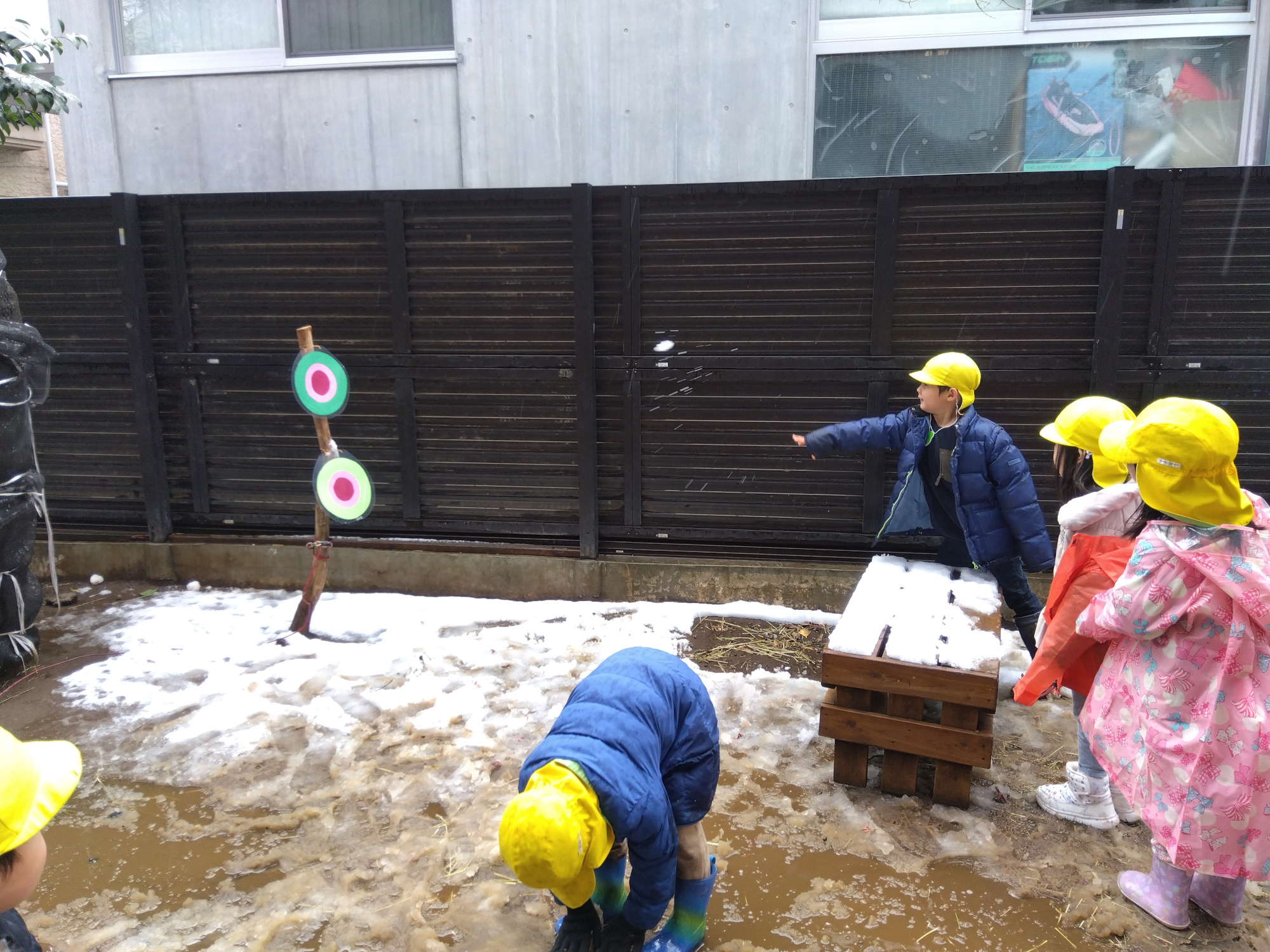 2月の大寒波の日、中目黒にも雪が積もりました。屋上や園庭に出ると積もった雪を見て「まっしろ!」と大盛り上がりな子どもたちでした。雪玉を使った的あてゲームもとても楽しみ、なかなか味わえない雪の日を満喫しました。