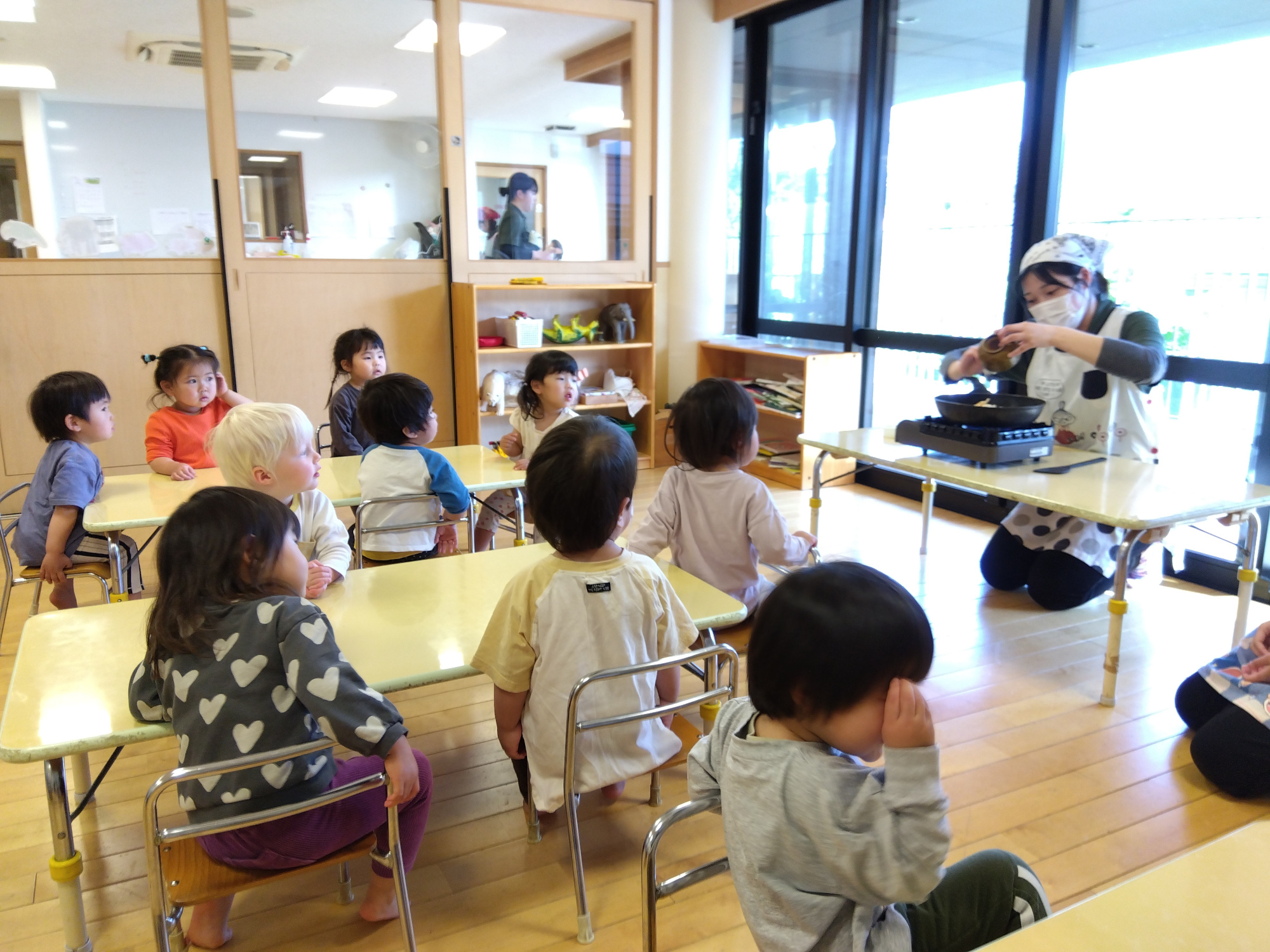 乳児クラスでは、お好み焼きに入れる野菜や作り方の絵を見ながら保育者の説明を真剣に聞いている姿や、実際にフライパンで焼いているところを興味津々に見る姿がありました。焼いているお好み焼きの良い香りがしてくると「美味しそう!」「良い匂い!」とワクワクしている様子がみえました。