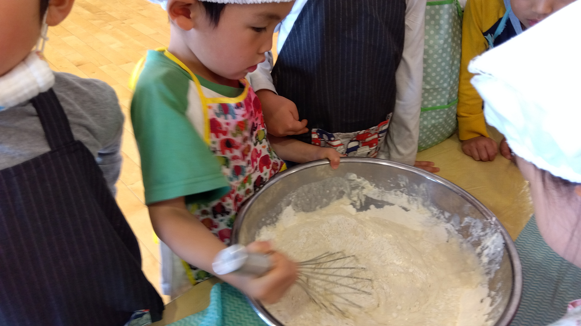 新年度が始まり新しいクラスでの生活に少しずつ慣れてきている子どもたちの姿が見られます。新年度、食育のスタートは「お好み焼きづくり」をしました。