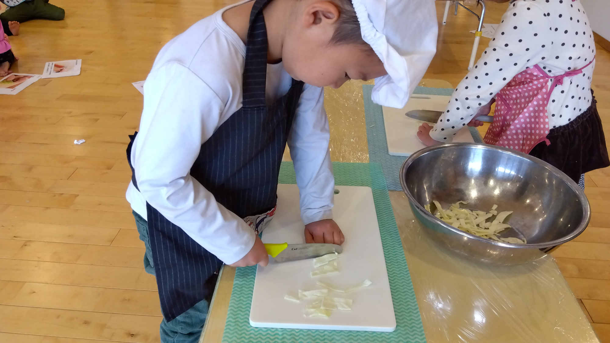 幼児クラスでは実際にキャベツや人参を切ってみたり、具材をかき混ぜたりしてお好み焼きづくりを楽しんでいました。はじめは「できるかな?」「包丁怖い!」と心配の声を上げる子どももいましたが、他の子どもが上手に料理をしているのを見て「私もやってみたい!」「美味しくなーれ!」と積極的に参加している様子がありました。
