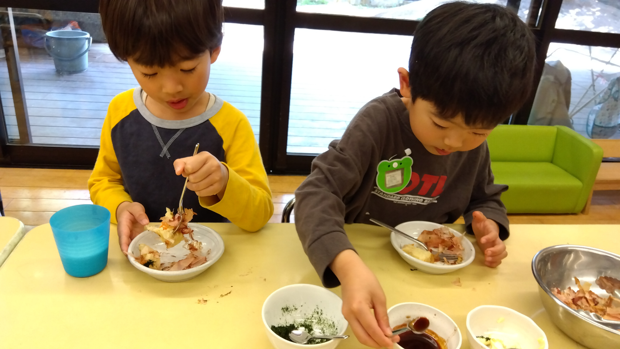 最後には自分たちで作ったお好み焼きを「美味しいね!」「上手にできたね!」と皆で気持ちを共有しながら美味しく食べることができました。包丁を使ったり具材を混ぜたりする体験が「できた!」という自己肯定感に繋がって欲しいと願う食育になりました。